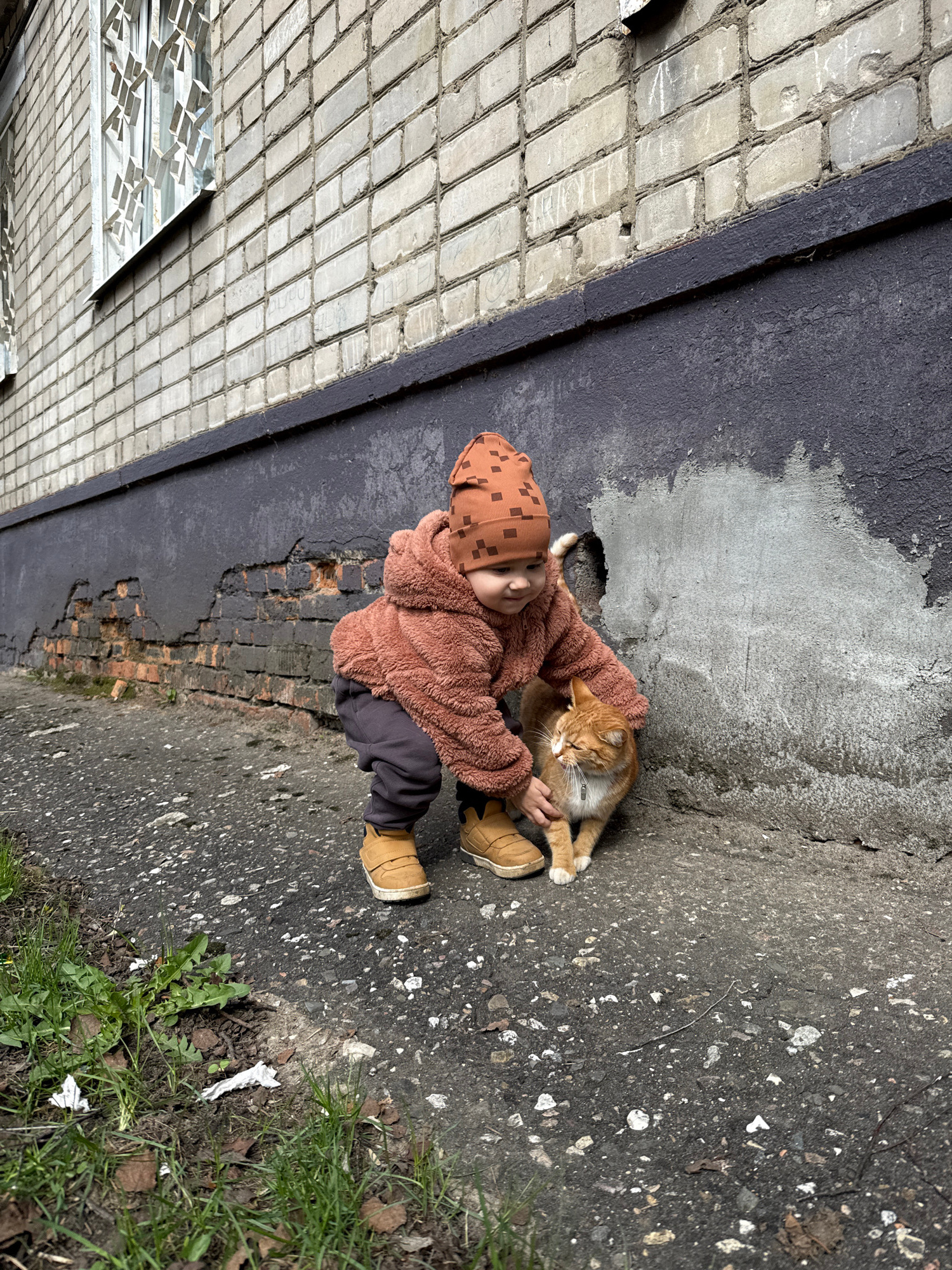 A child in brown clothing and a hat is sitting on a concrete surface, petting an orange cat. The surface appears to be a pavement or sidewalk area. In the background, there's a building wall constructβ¦read more