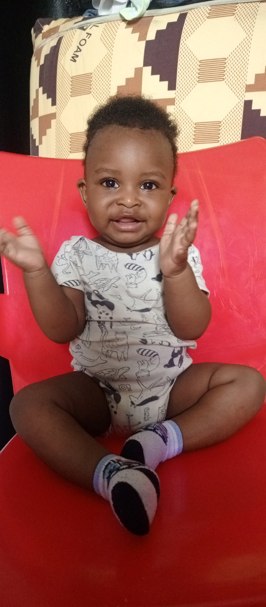 A dark-skinned baby with dark, curly hair is seated on a bright red chair, looking directly at the viewer with wide, dark eyes and an open-mouthed smile. The baby's hands are raised to chest height, p…read more