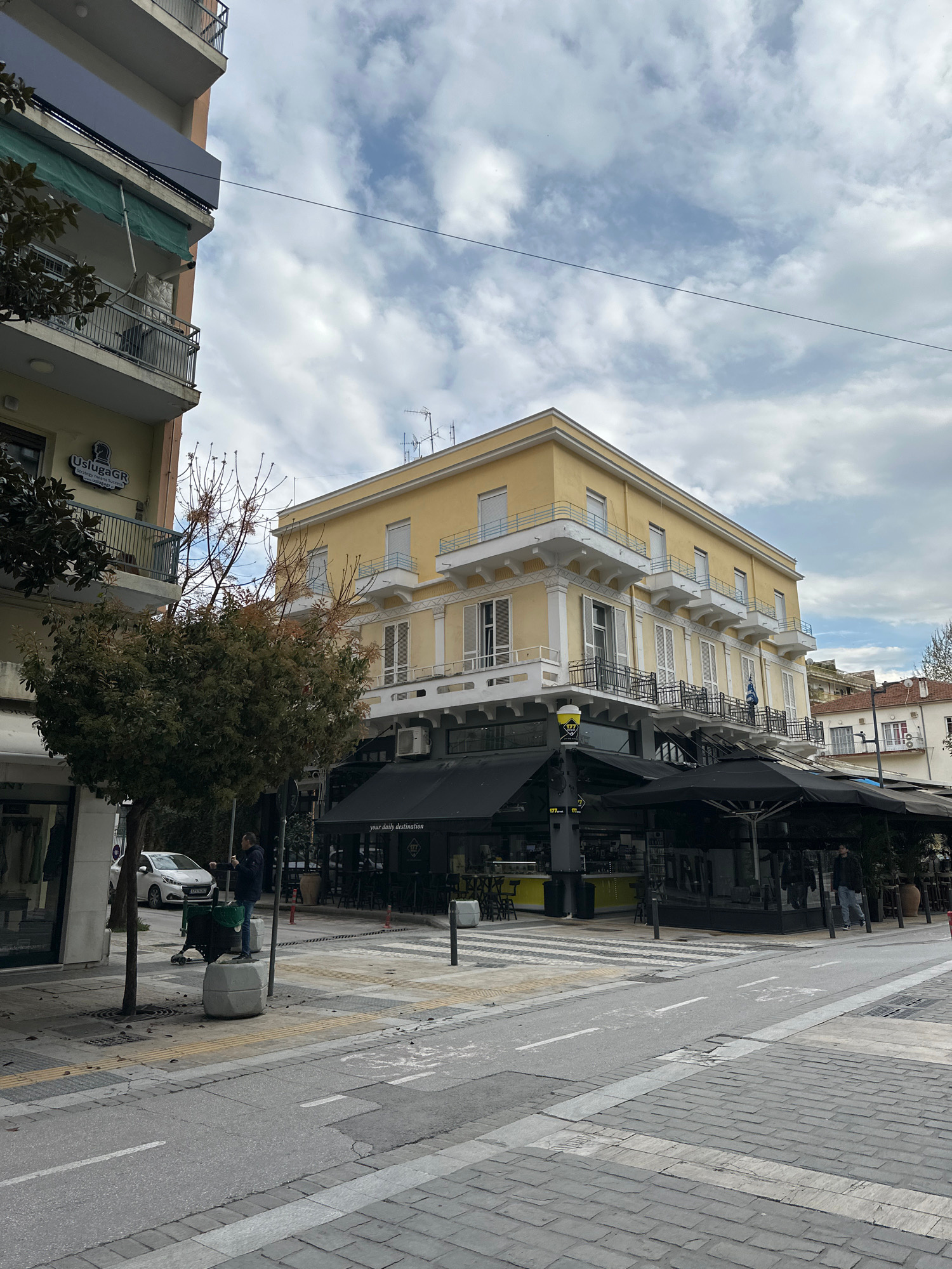 The image depicts a street scene in Serres, Greece. A yellow building with white balconies stands prominently, framed against a partly cloudy sky. The street features a pedestrian walkway made of patt…read more