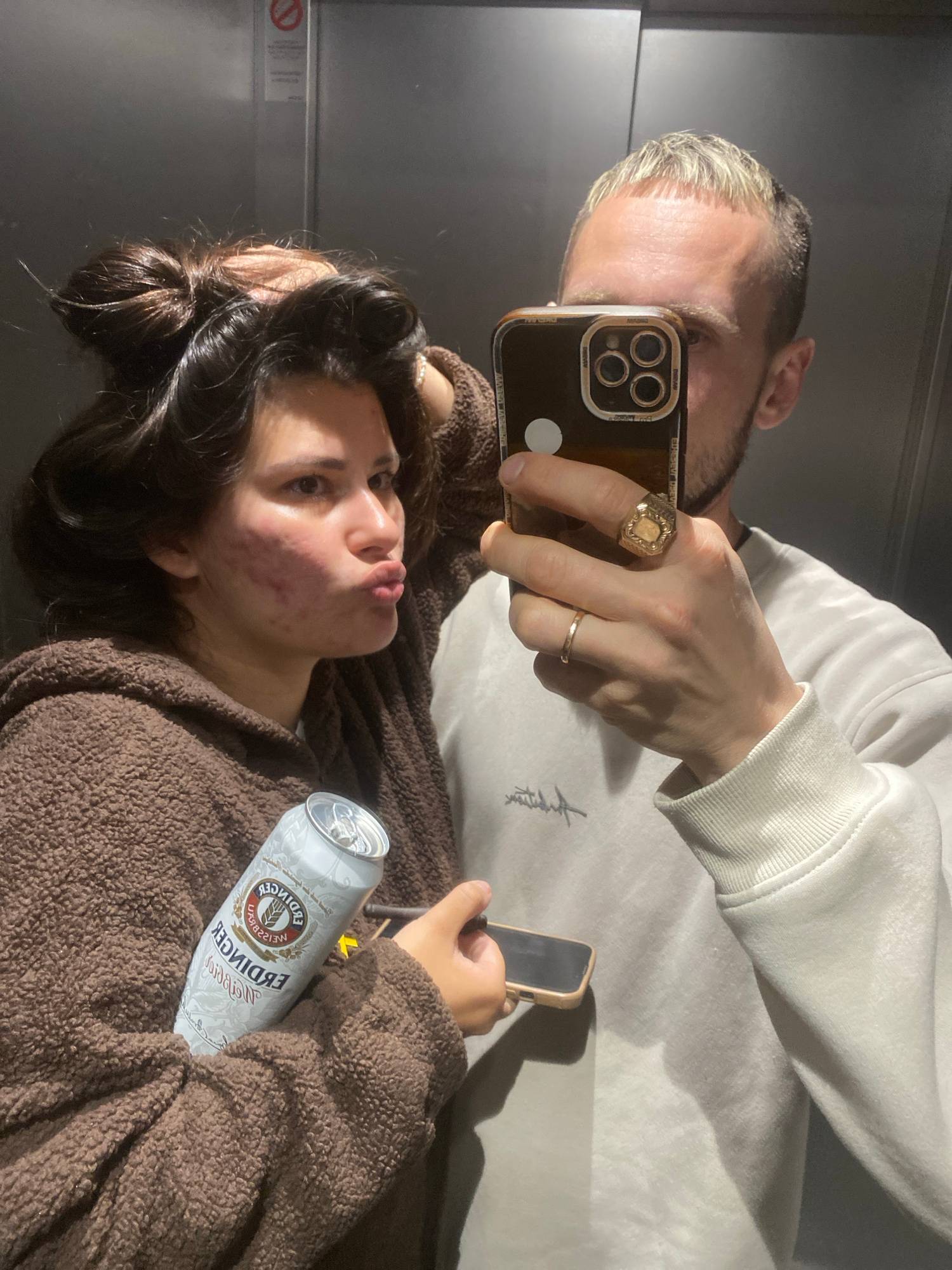 A reflection of two people taking a selfie in what appears to be an elevator. The man is holding a cell phone, with a gold ring on his ring finger and a larger, decorative ring on his middle finger. H…read more