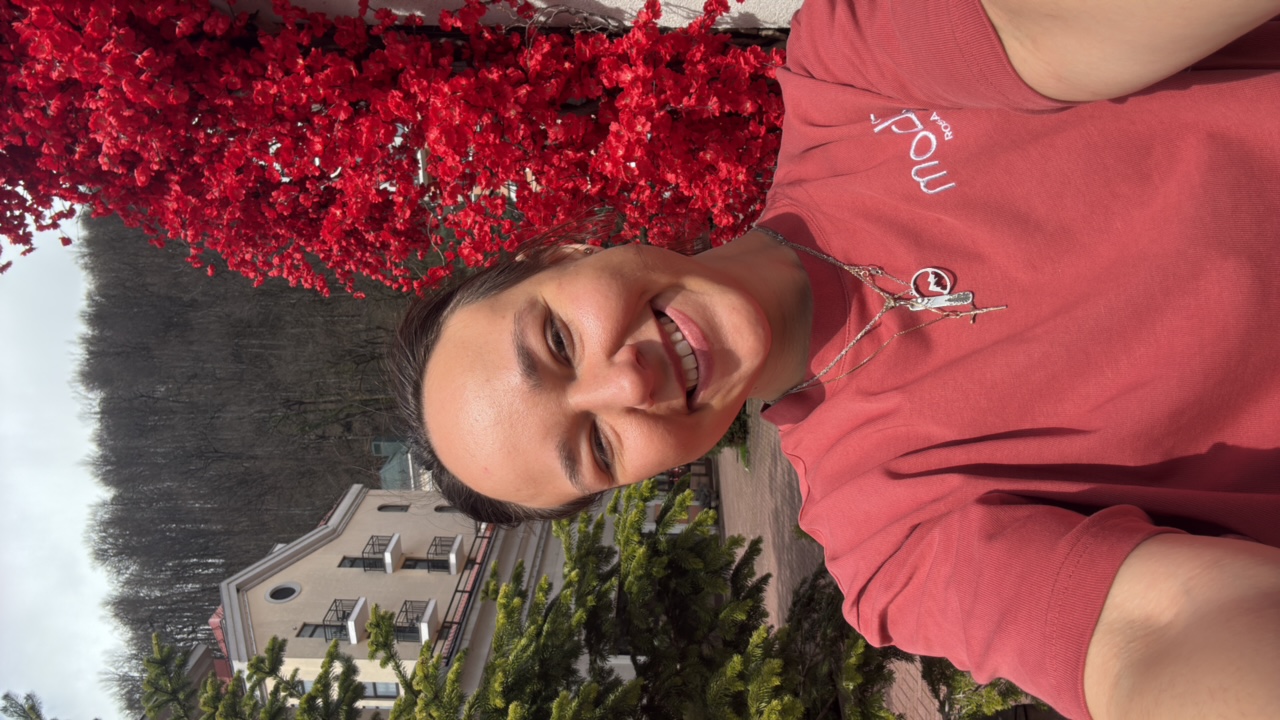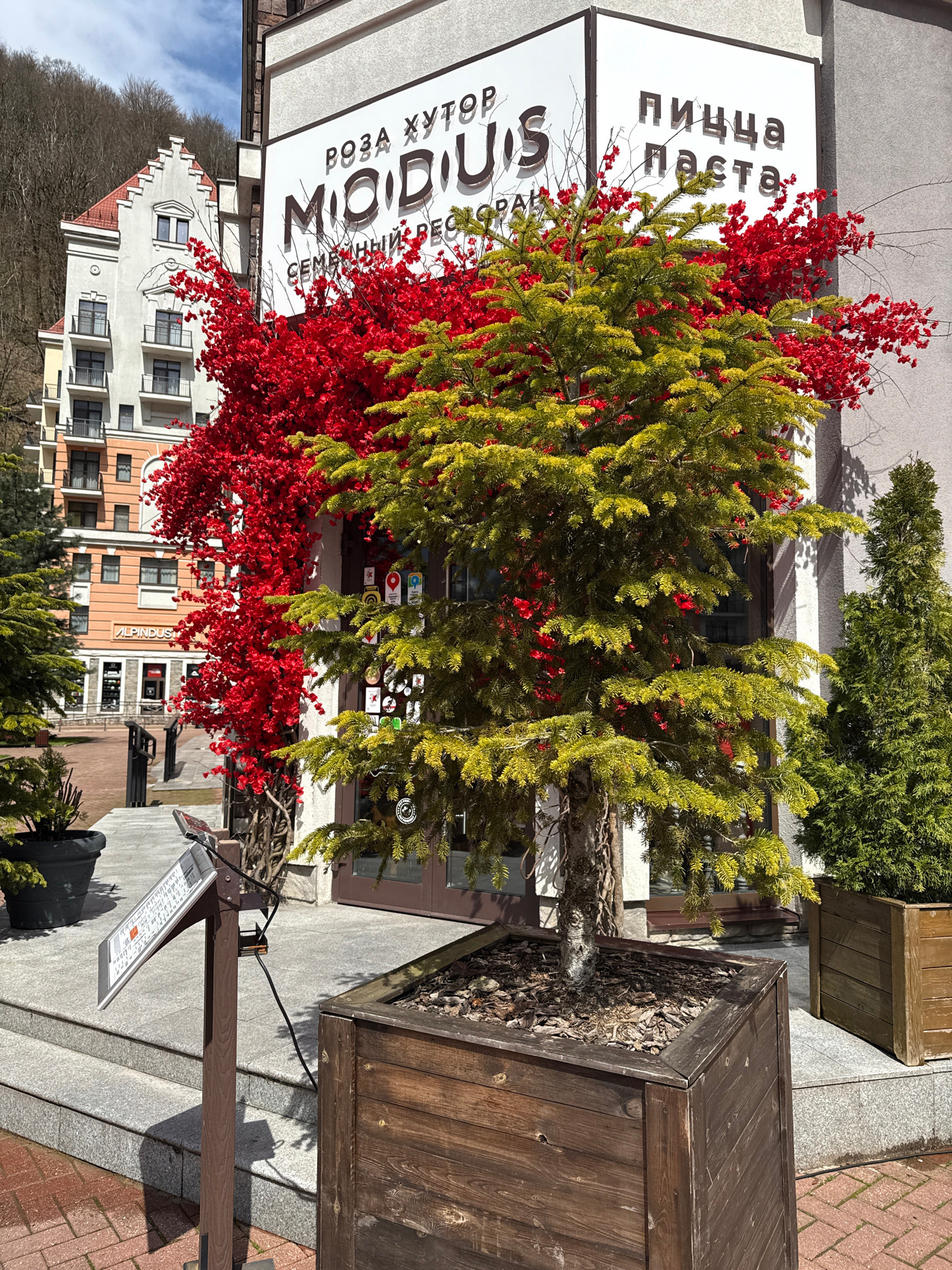 The image shows a street scene in Estosadok, Russia. A restaurant named "Modus" is visible, with a sign written in Cyrillic script. A small tree with red flowers stands next to the restaurant sign. A…read more