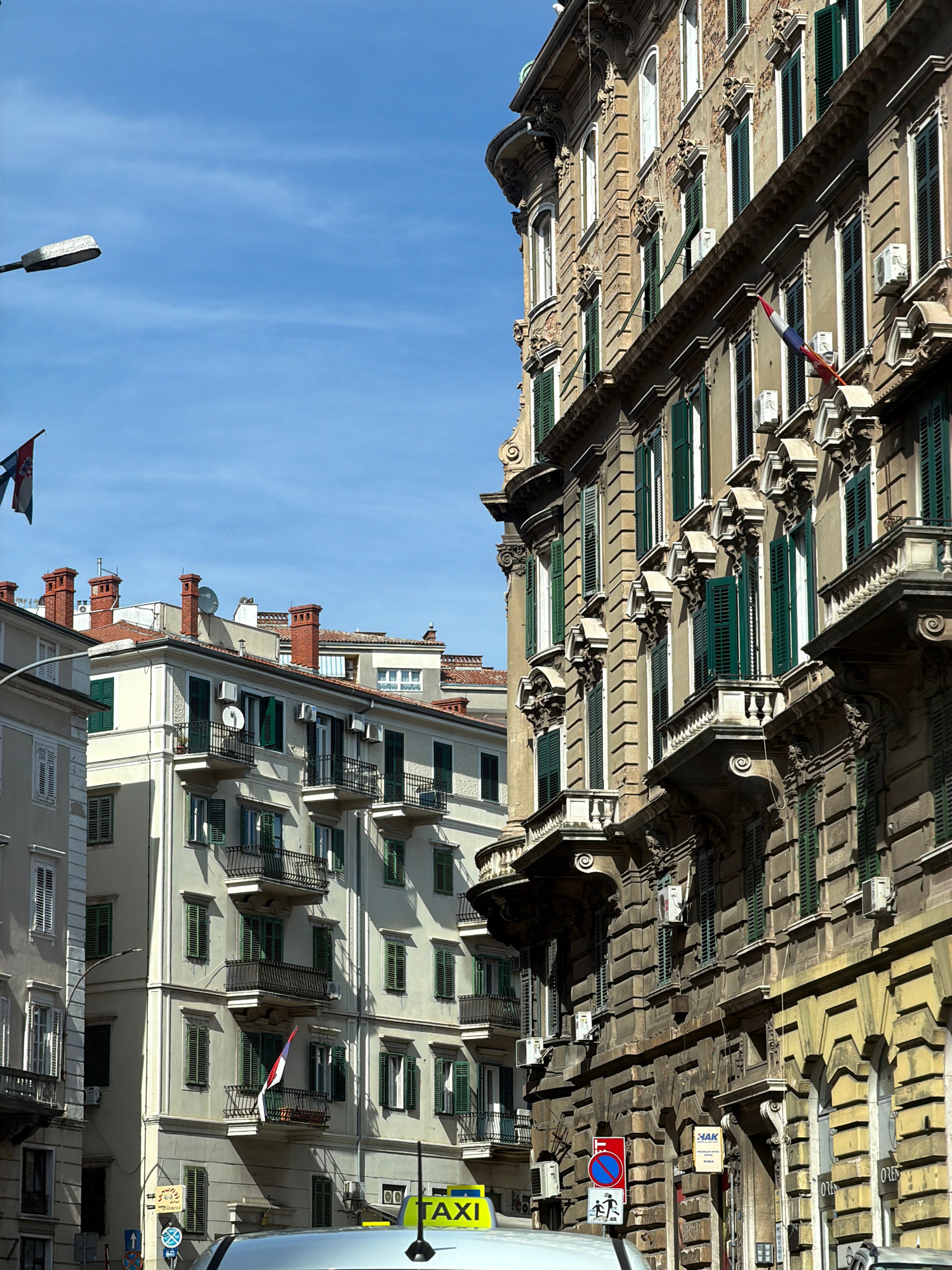 The image shows a street scene in Grad Rijeka, Croatia, looking up at buildings and a blue sky. On the right side of the image, there is a building with multiple stories, each featuring rows of window…read more