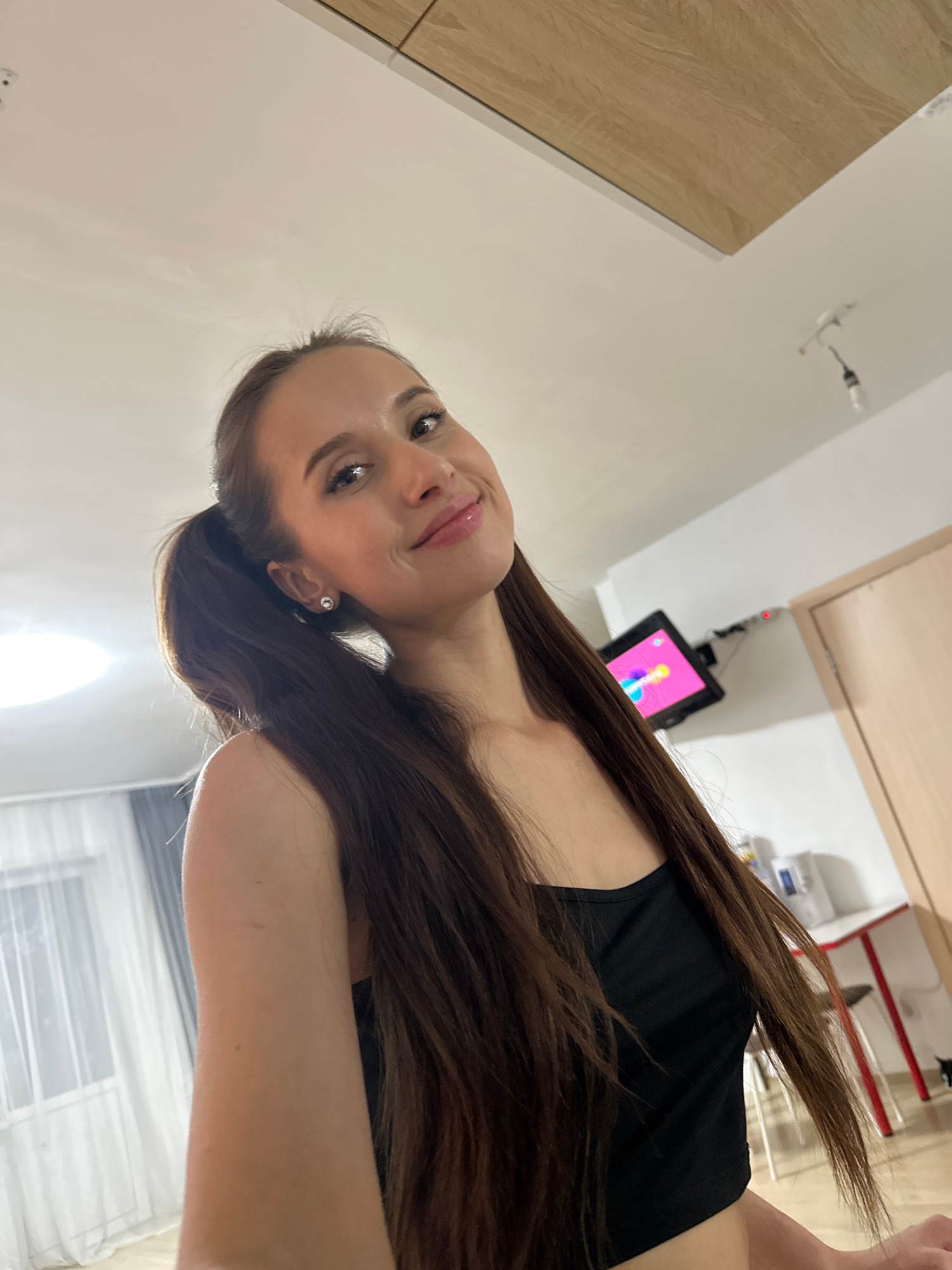 A woman with long brown hair is depicted in an indoor setting. The camera angle is tilted, offering a close-up view of her face and upper body. She is wearing a black top. A screen with a pink backgro…read more