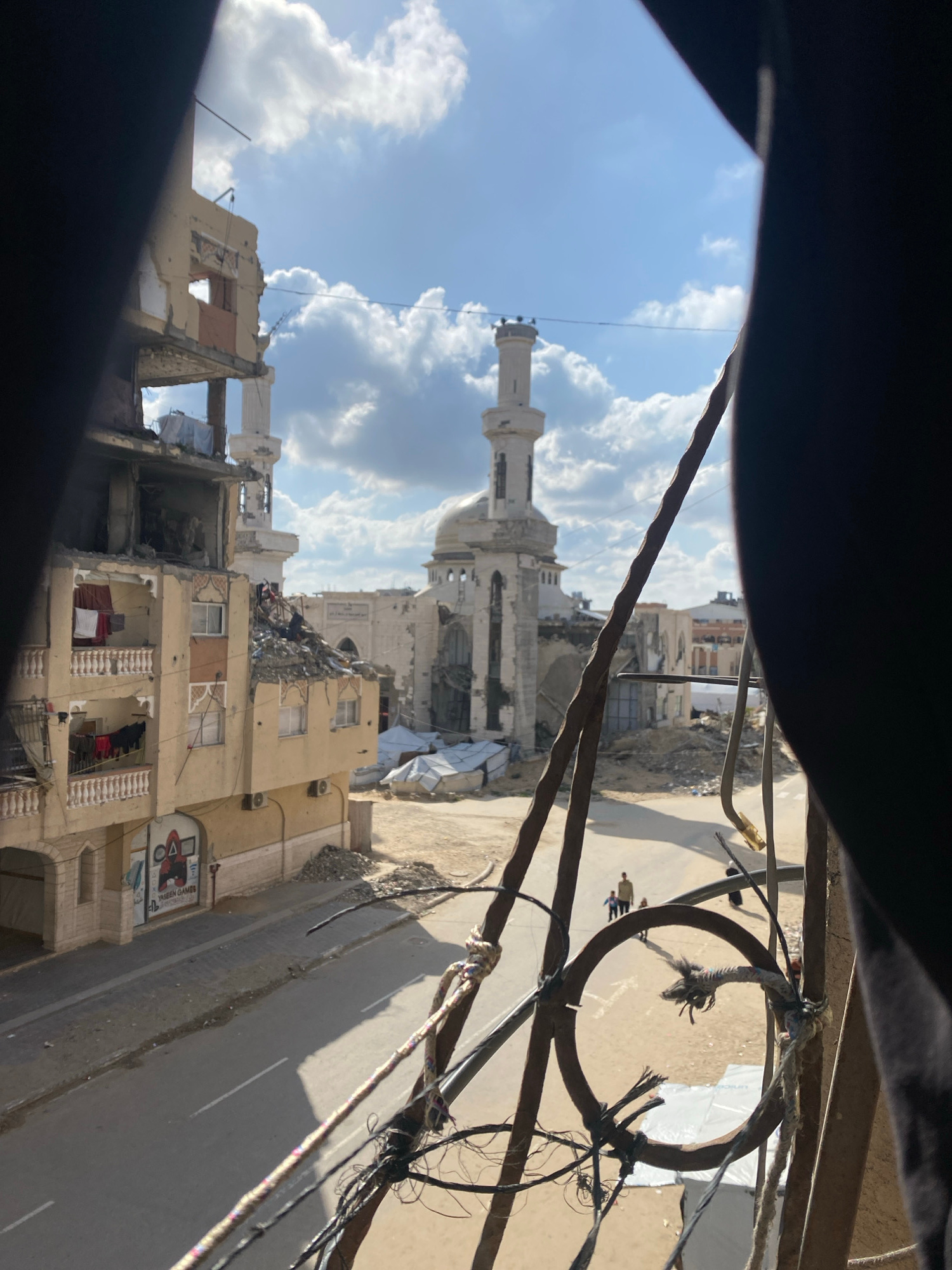 The image depicts a scene in Khan Yunis, Palestinian Territory, showing significant structural damage to buildings. A mosque with a partially damaged minaret stands in the background, partially destro…read more