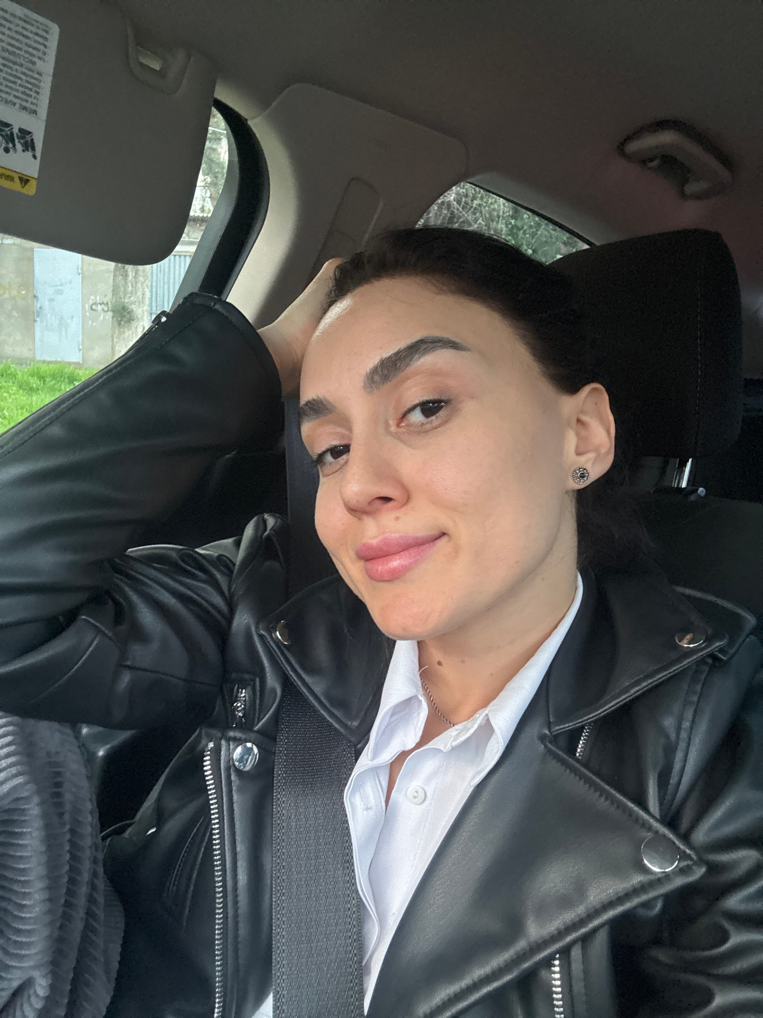 A person wearing a black leather jacket and a white collared shirt is seated in a car. The person is leaning their head against the headrest. The interior of the car is visible, including the sun viso…read more