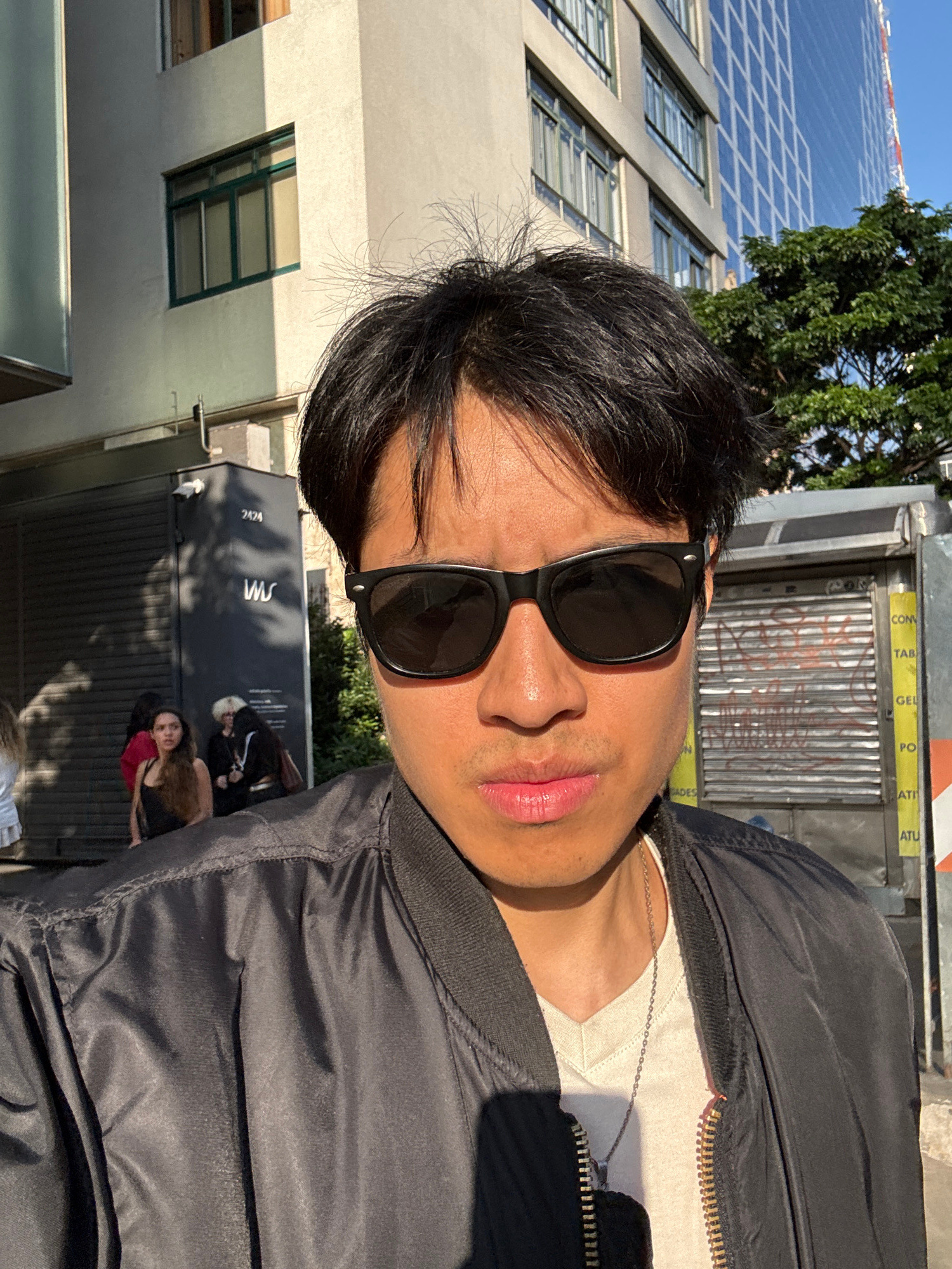 A medium shot presents a person wearing sunglasses and a jacket. Buildings and trees are visible in the background. Other individuals can be seen in the background. The image was taken outdoors. Based…read more