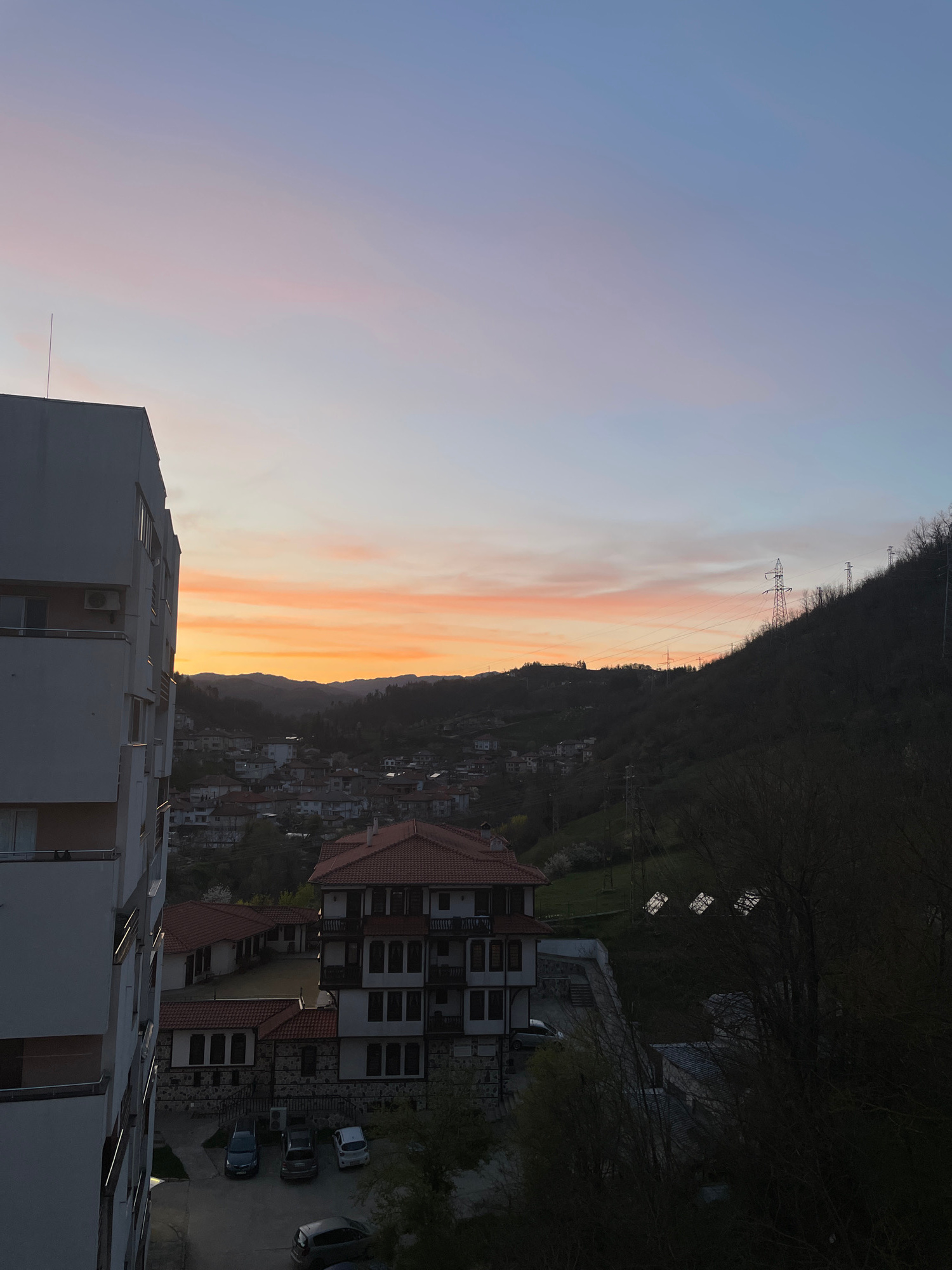 The image depicts a cityscape at sunset, possibly in Zlatograd, Bulgaria. The sky transitions from blue to orange hues. A mountain range is visible, partially obscured by trees and with electrical pyl…read more