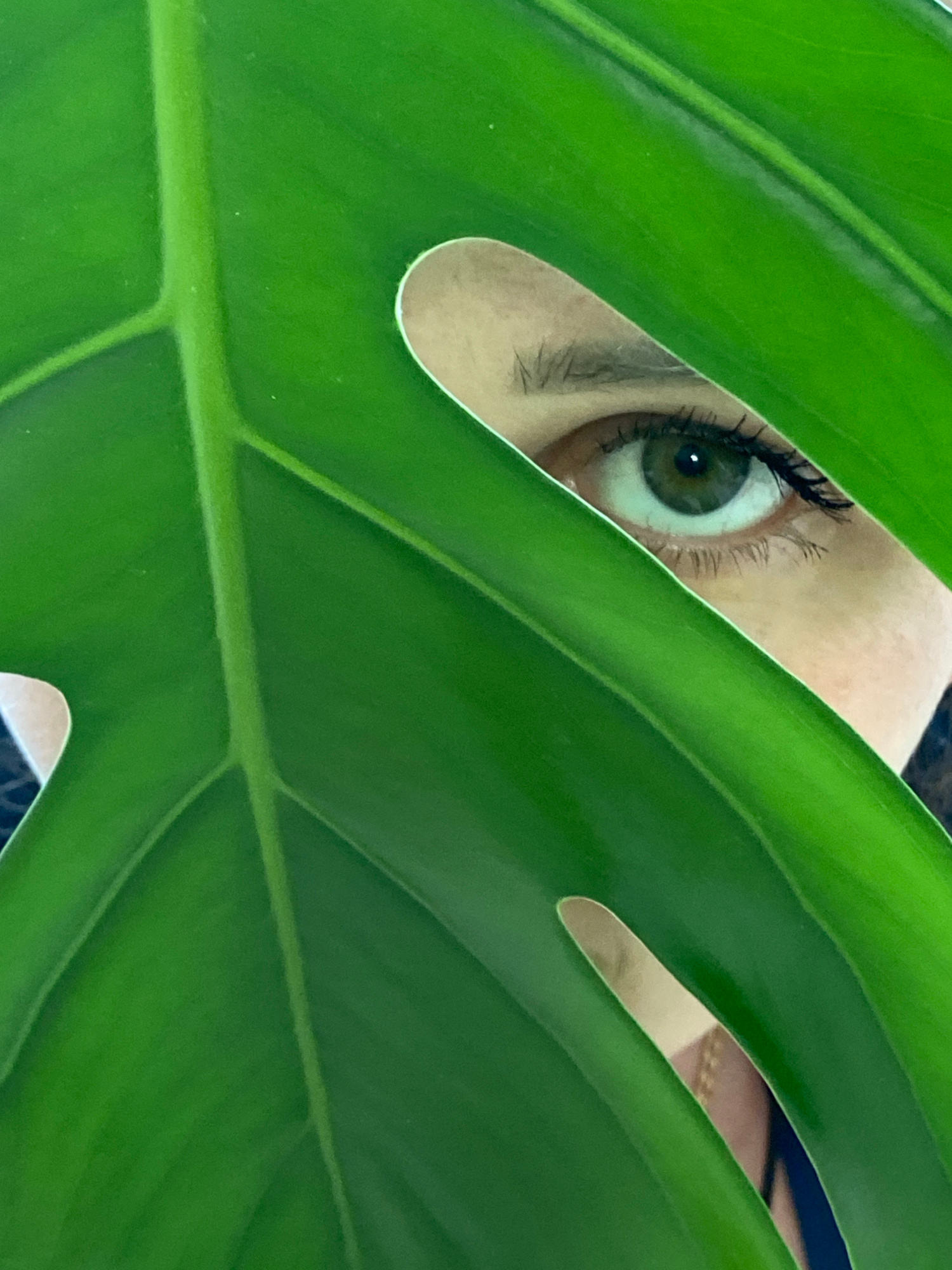 A close-up image shows a person's eye peeking through a large, vibrant green monstera leaf. The eye is green, with dark lashes. The leaf fills most of the frame. The location is not discernible from t…read more