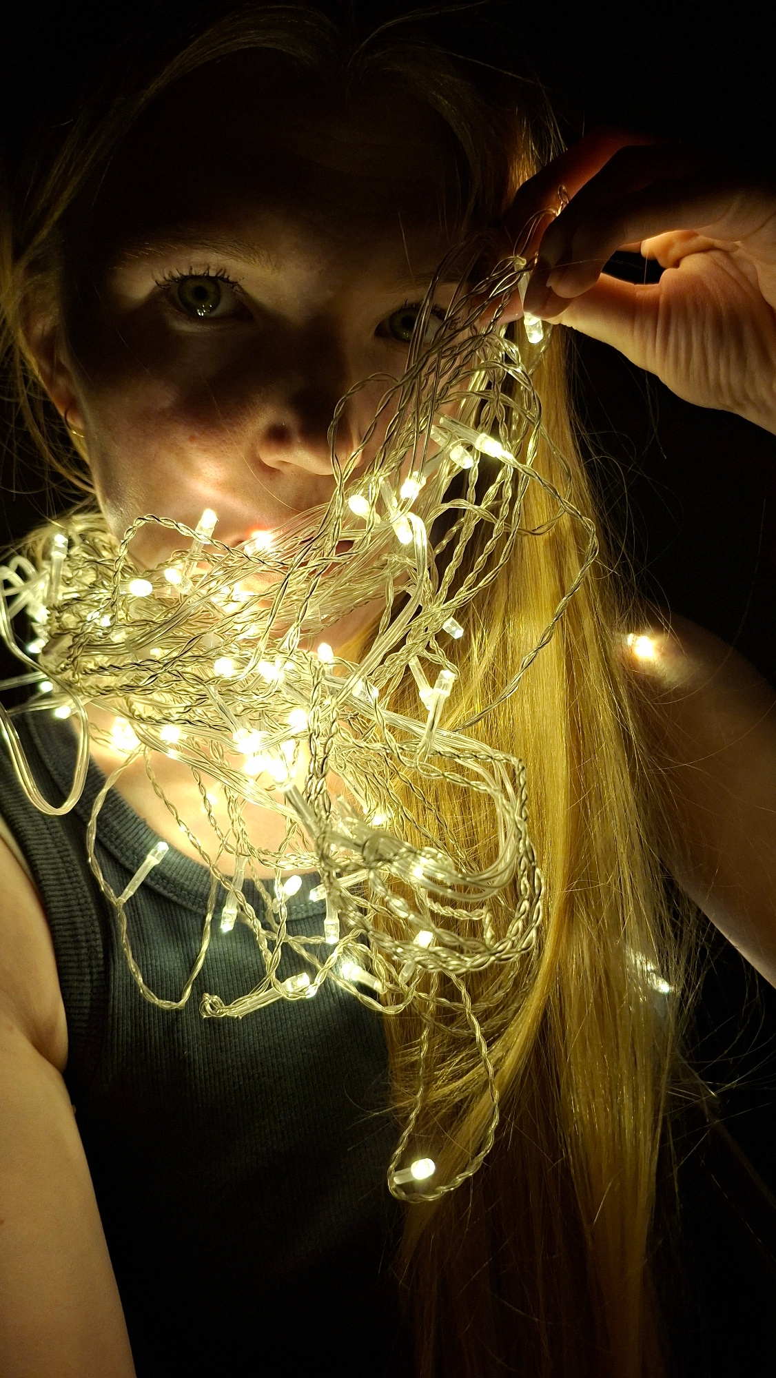 A person is lying on their back in the dark, with their head surrounded by strands of small, glowing fairy lights. The person has fair skin and light blonde hair. One hand is visible near their forehe…read more