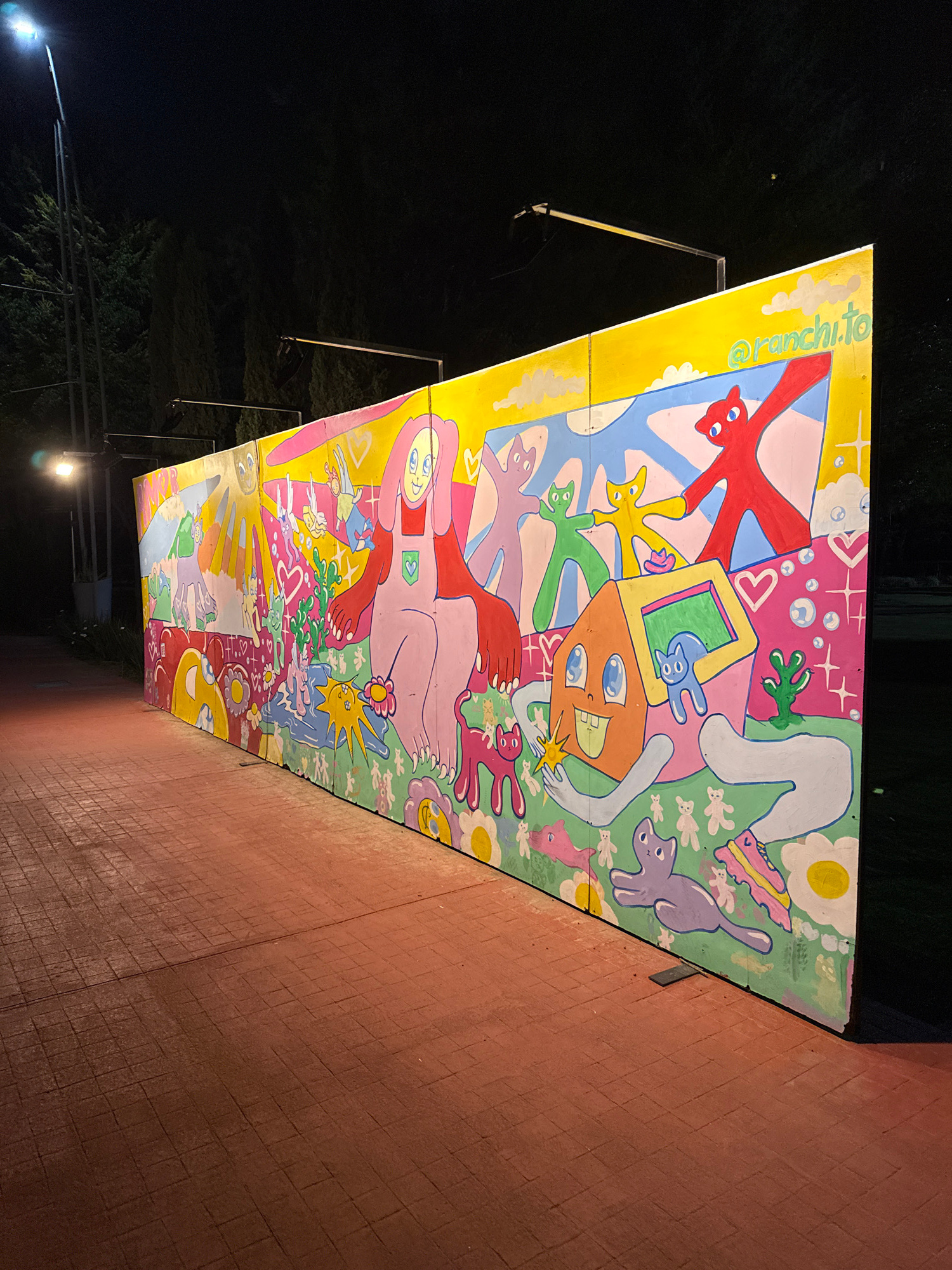 Here is a description of the image: The image shows an outdoor mural located along a brick wall. The mural is brightly colored with cartoonish figures and shapes. The mural is supported by metal bars…read more