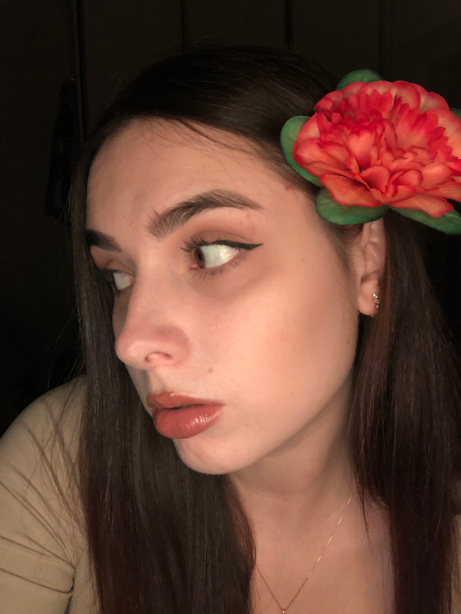 A close-up image depicts a woman's face in profile, tilted to the right. She has dark hair and fair skin. A large, artificial red flower is positioned near her ear. She is wearing eyeliner and lipstic…read more