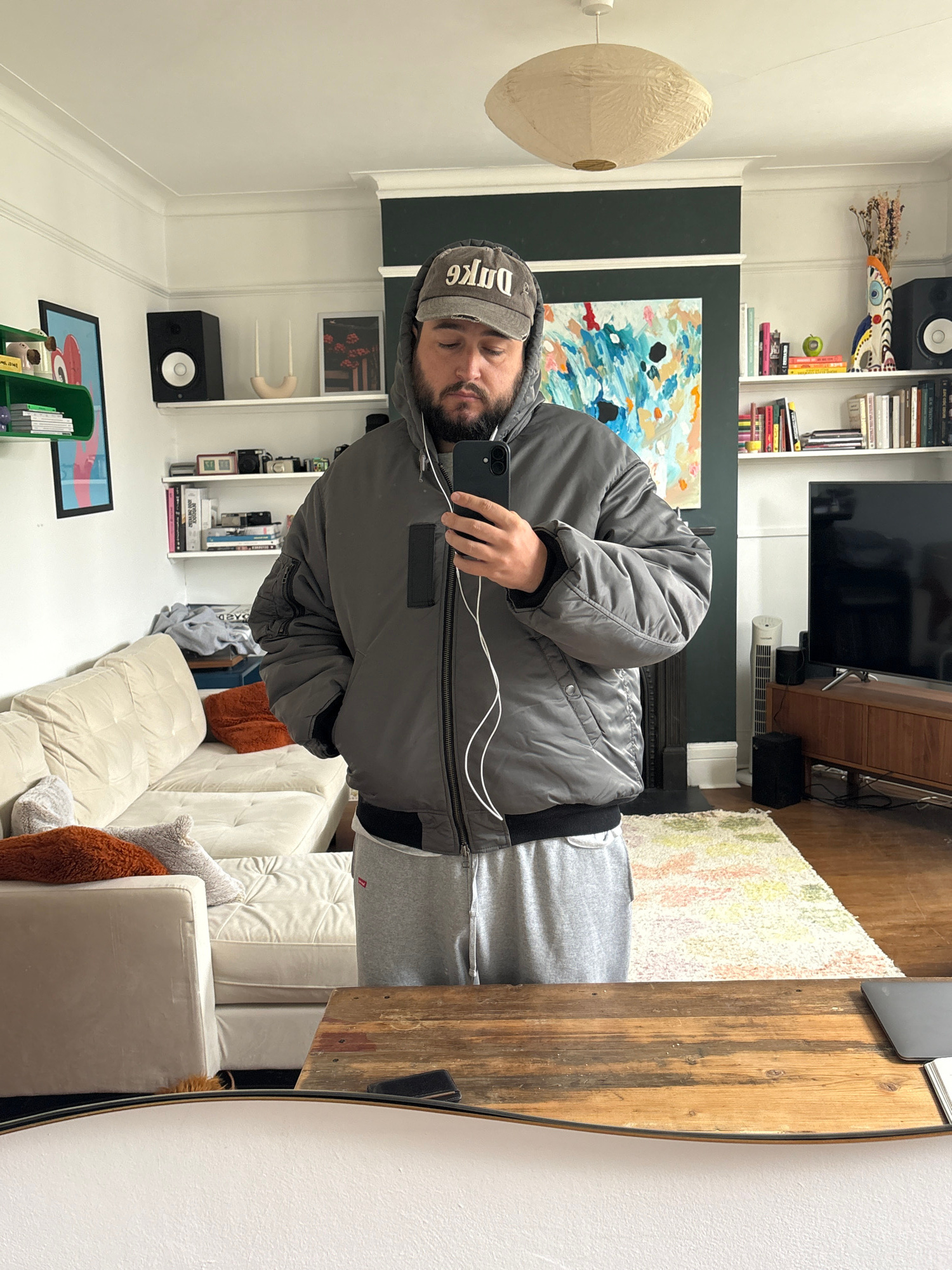 A man stands in what appears to be a London residence, holding a smartphone. He is reflected in a mirror, capturing his image and the environment behind him. He is wearing a grey jacket and sweatpants…read more