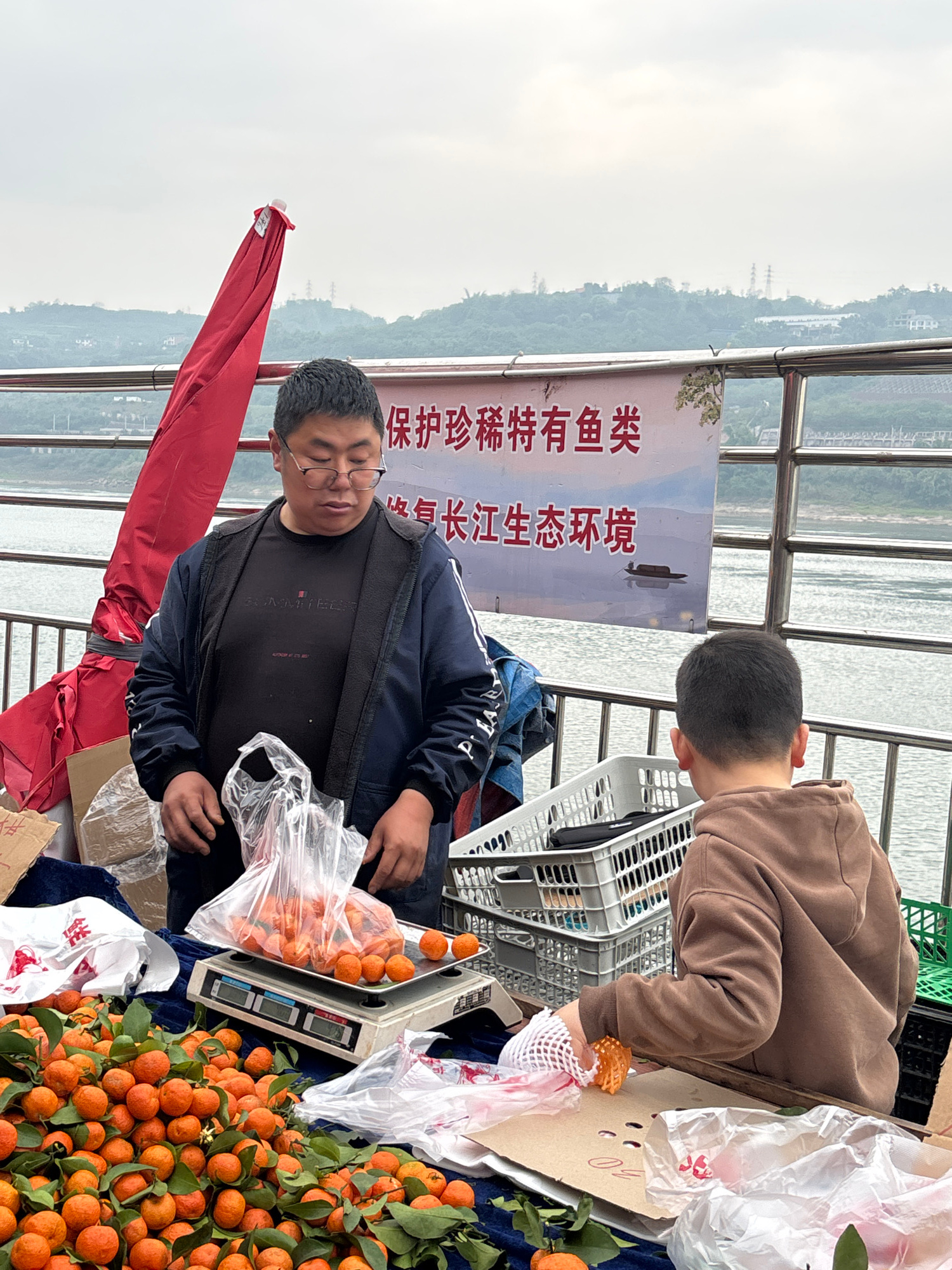 A man and a child are near a display of oranges at a roadside stand in Jiangjin, China. The man, wearing glasses and a navy jacket, is filling a plastic bag with oranges on a digital scale. The child,…read more