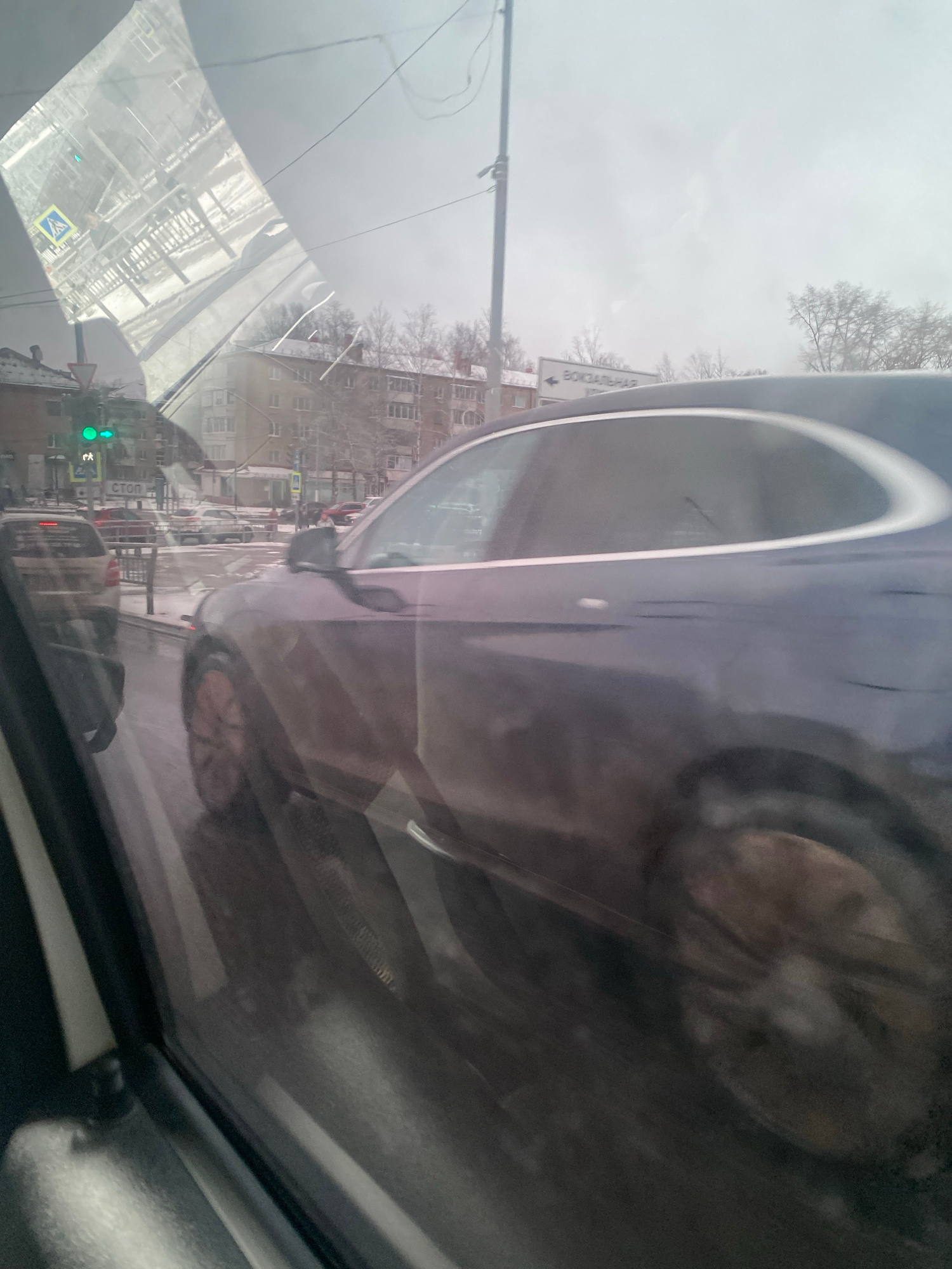 The image shows a view from inside a car in Chaikovsky, Russia. Another car is visible in the side mirror and through the windshield. Buildings, trees, traffic signals, and street signs are visible in…read more