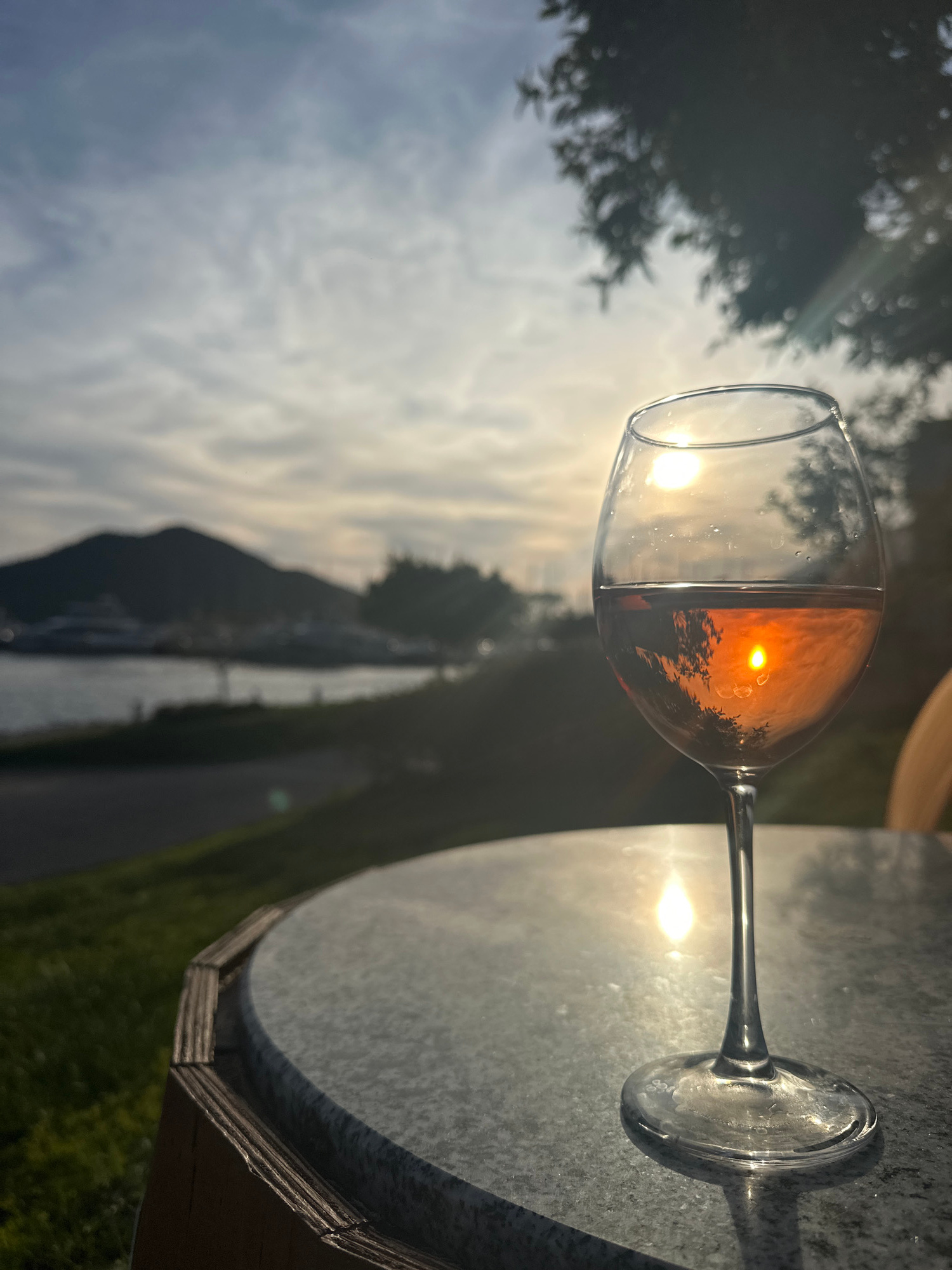 The image shows a wine glass partially filled with a reddish liquid, positioned on a grey, speckled, round tabletop, likely outside. A bright sun is reflected in the glass and on the table. The backgr…read more