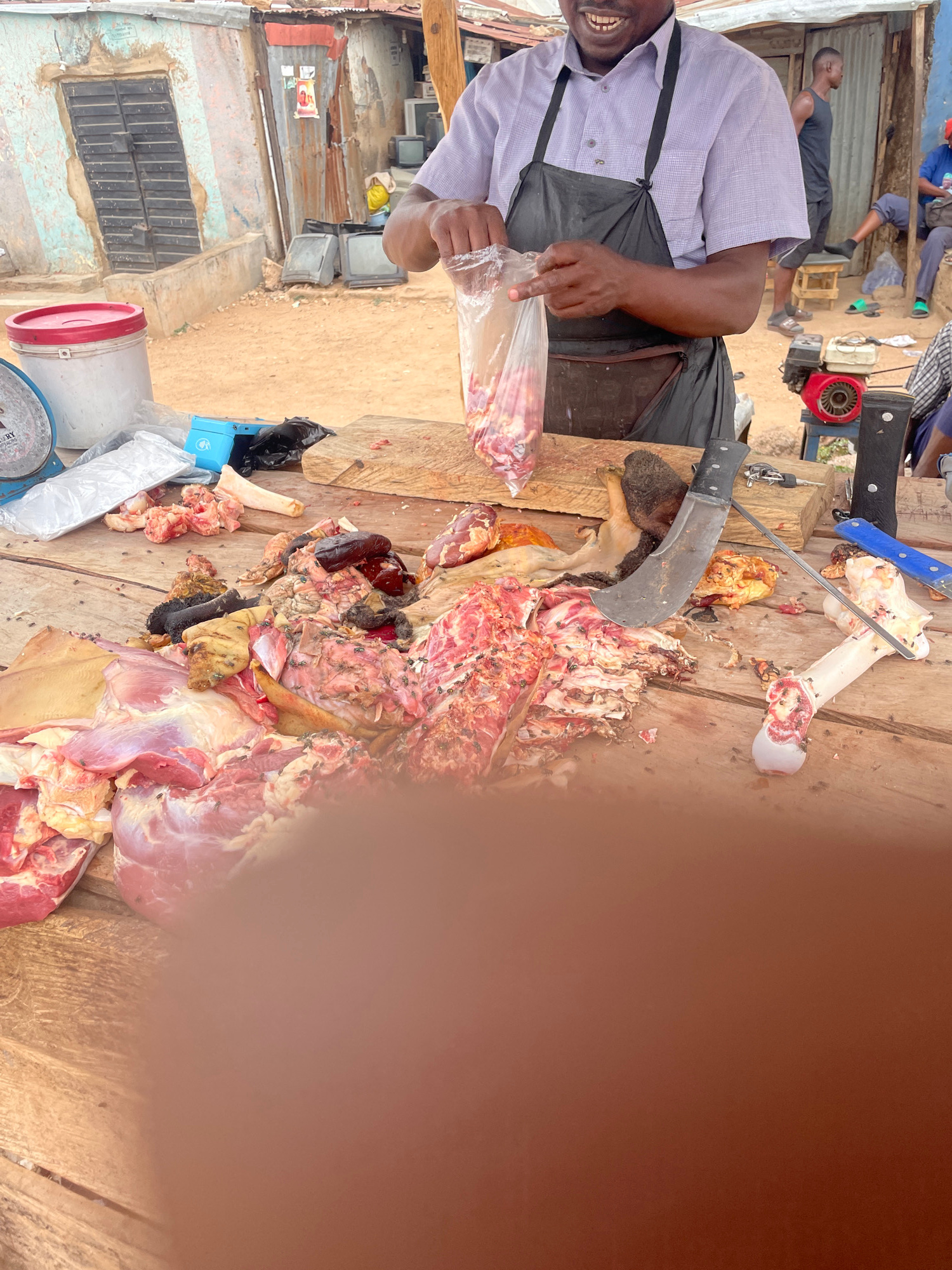 The image depicts a butcher standing next to a table laden with raw meat, including bones, fat, and various cuts. He is holding a plastic bag, presumably to pack the meat. A large cleaver lies on the…read more