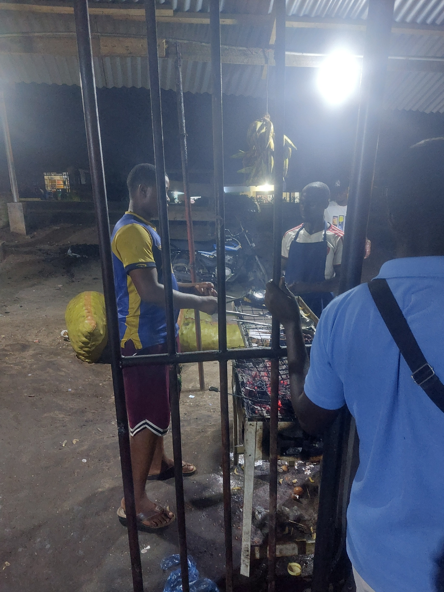 The scene captured in the image is an outdoor area at night in Dar es-Salaam, Tanzania. The environment is dimly lit by a bright light in the background. A metal structure of horizontal bars is in the…read more