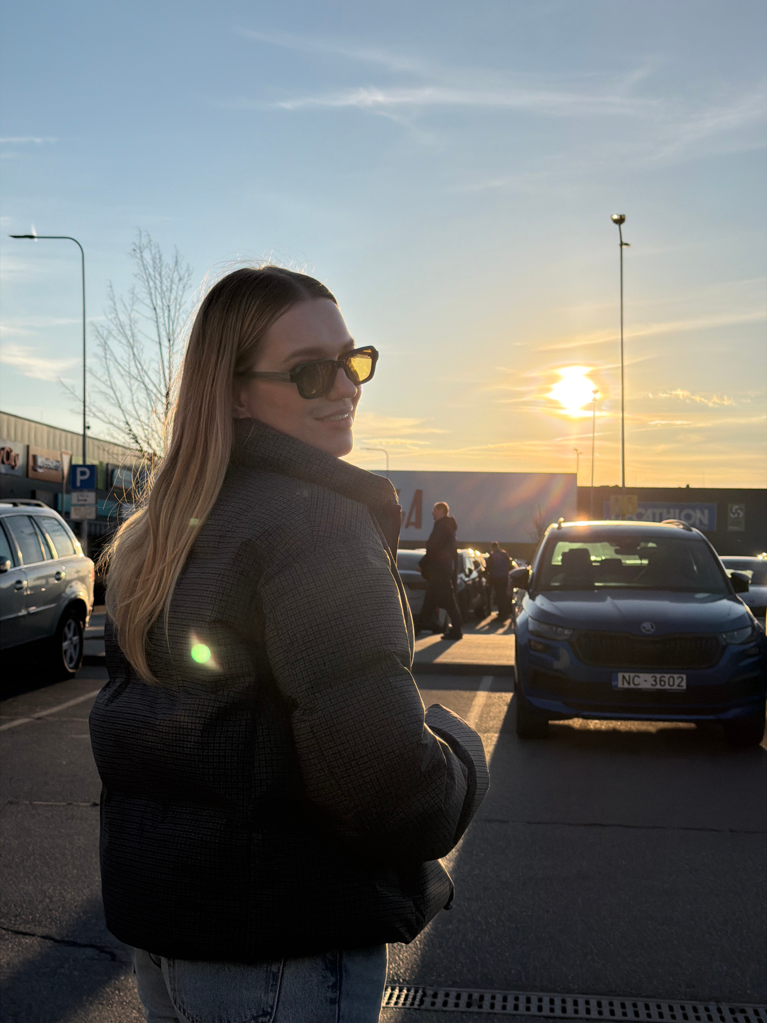 The image shows a woman in sunglasses and a dark patterned jacket standing in a parking lot at sunset. The location is likely Ulbroka, Latvia, given the license plate "NC-3602" on a blue car parked be…read more