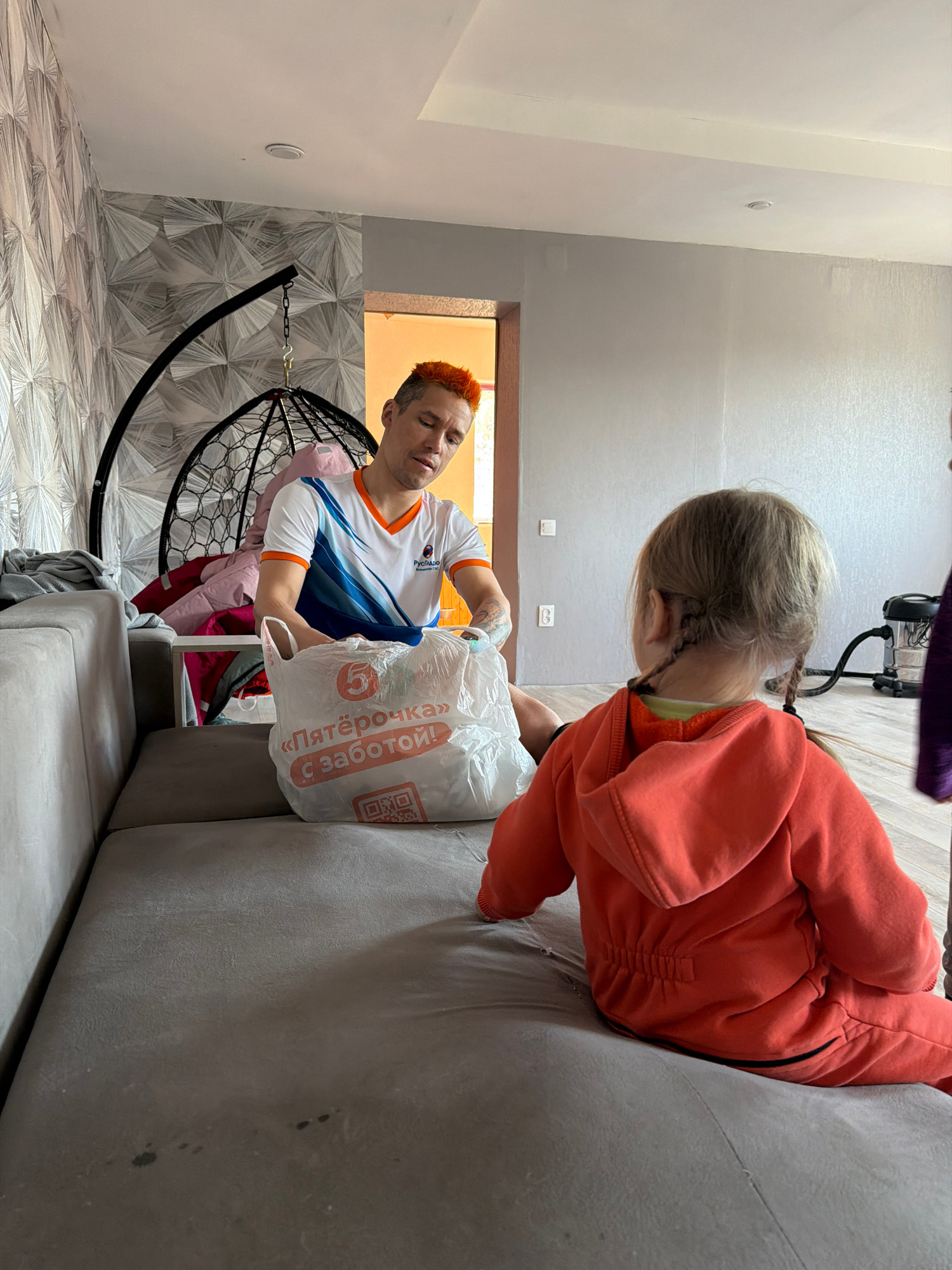 The scene depicts a person with bright orange hair, wearing a white and blue athletic shirt, seated in a hanging chair within a room. A child with pigtails, dressed in an orange jumpsuit, leans over t…read more