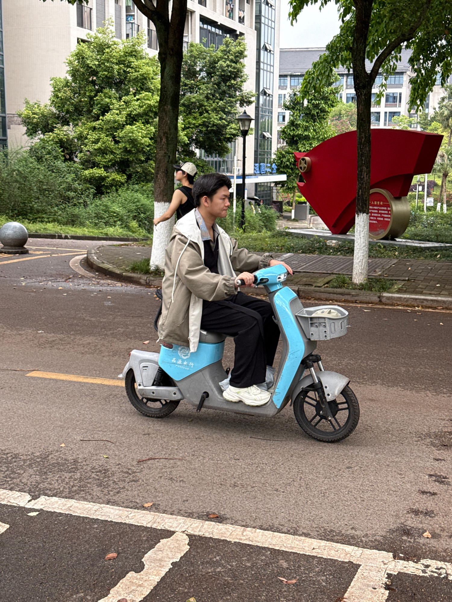 A person wearing a beige jacket, black pants, and white sneakers is sitting on a blue electric scooter on a paved road. A second person, wearing a white baseball cap, is standing beside the scooter. T…read more
