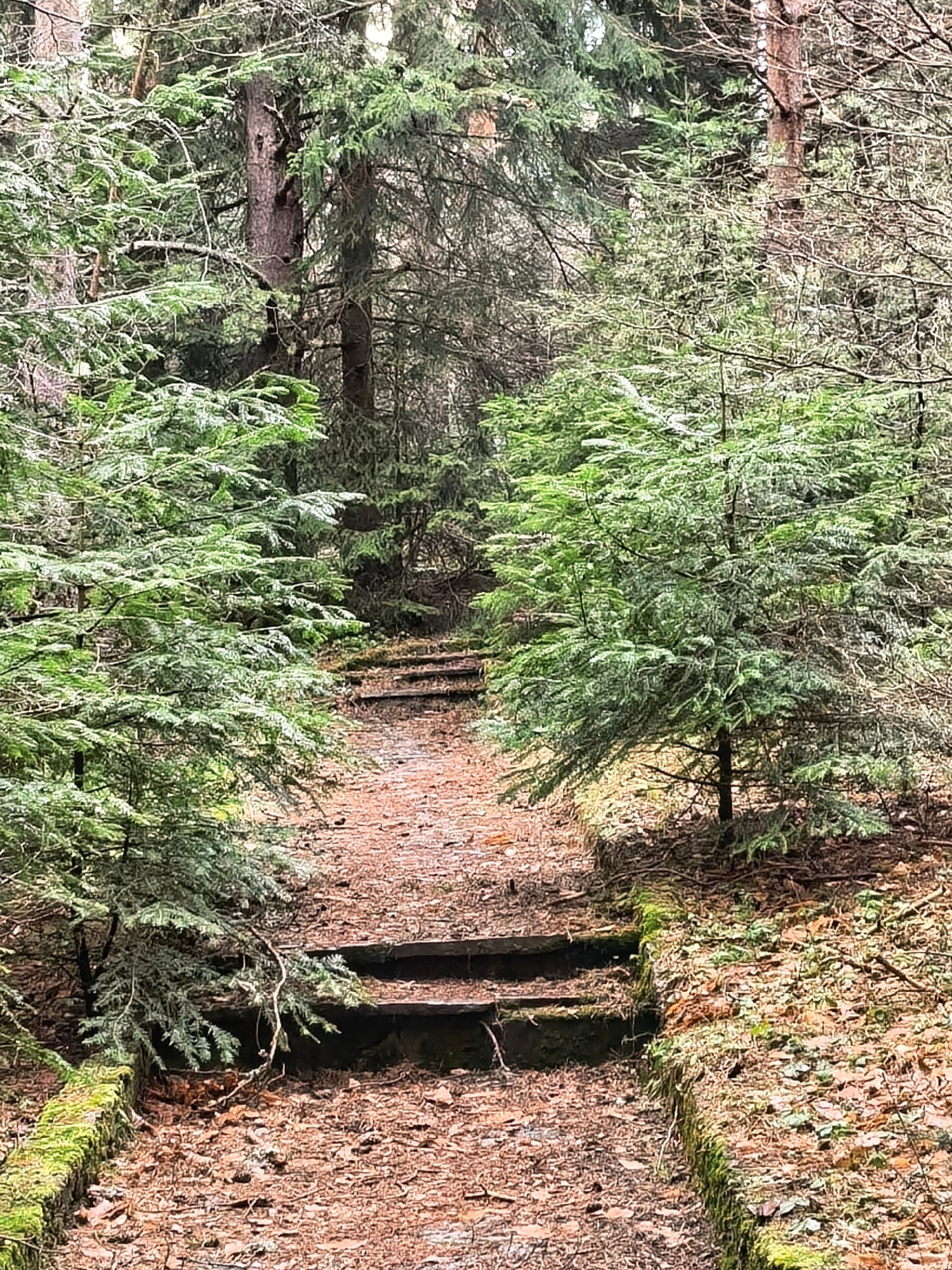 A forest path with wooden steps leads uphill. The path is covered in brown leaves and flanked by moss-covered embankments. Evergreen trees line the path, partially obscuring the view ahead. The locati…read more
