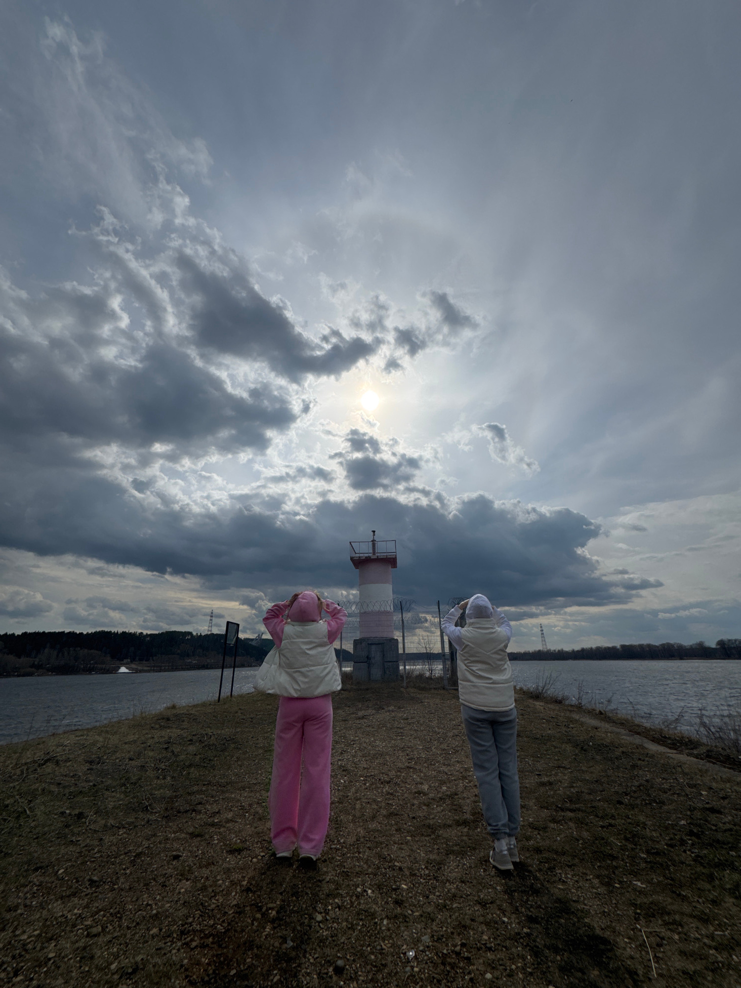 This image, captured in Chaikovsky, Russia, depicts an outdoor scene by a large body of water, likely the Kama River. The sky is a dramatic expanse of heavy, dark grey clouds, with bright sunlight pie…read more