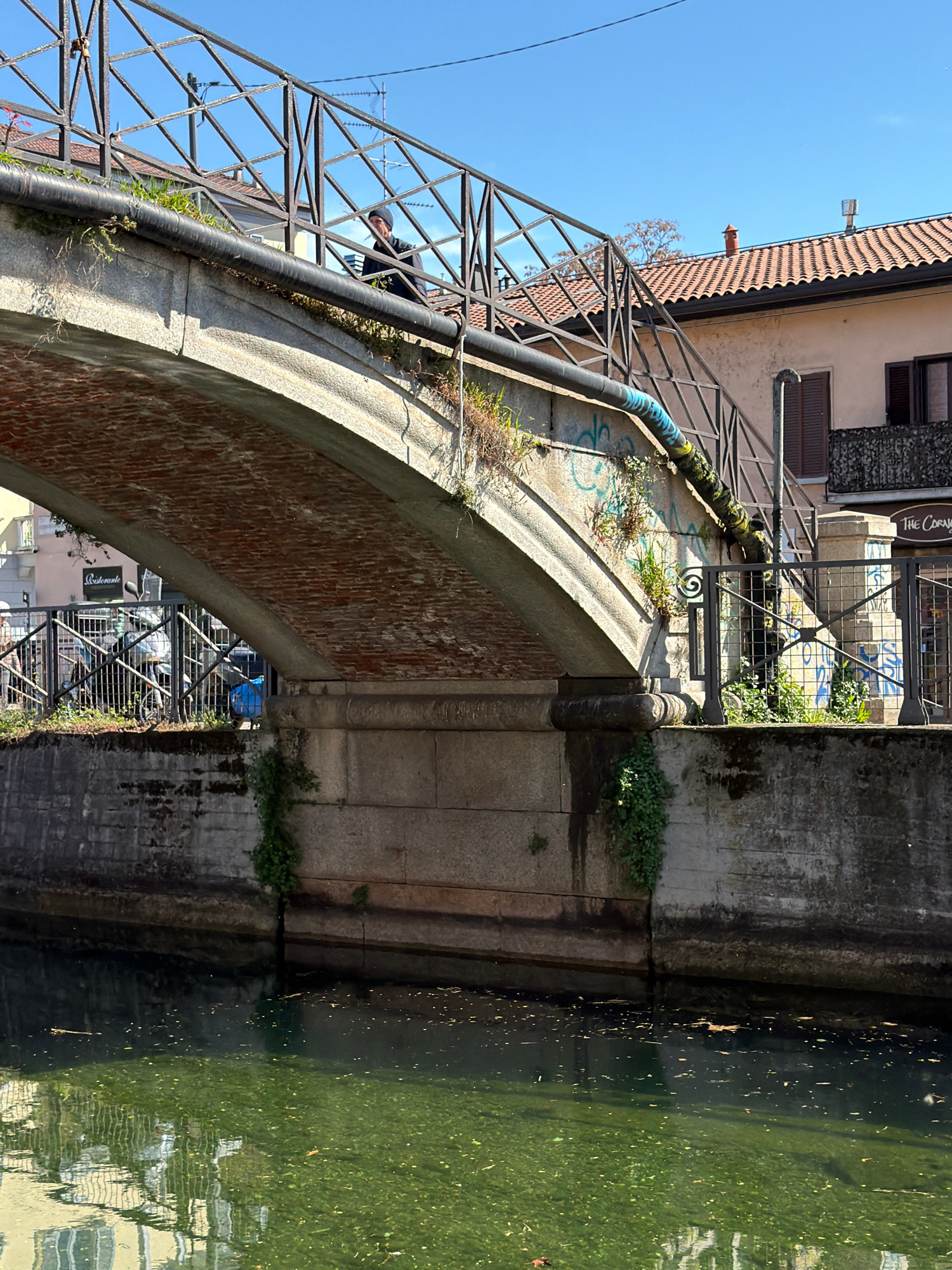 The image depicts an arched stone bridge spanning a canal in the Navigli district of Milan, Italy, under a clear blue sky. The bridge's underside is constructed from red brick, while its arch and abut…read more