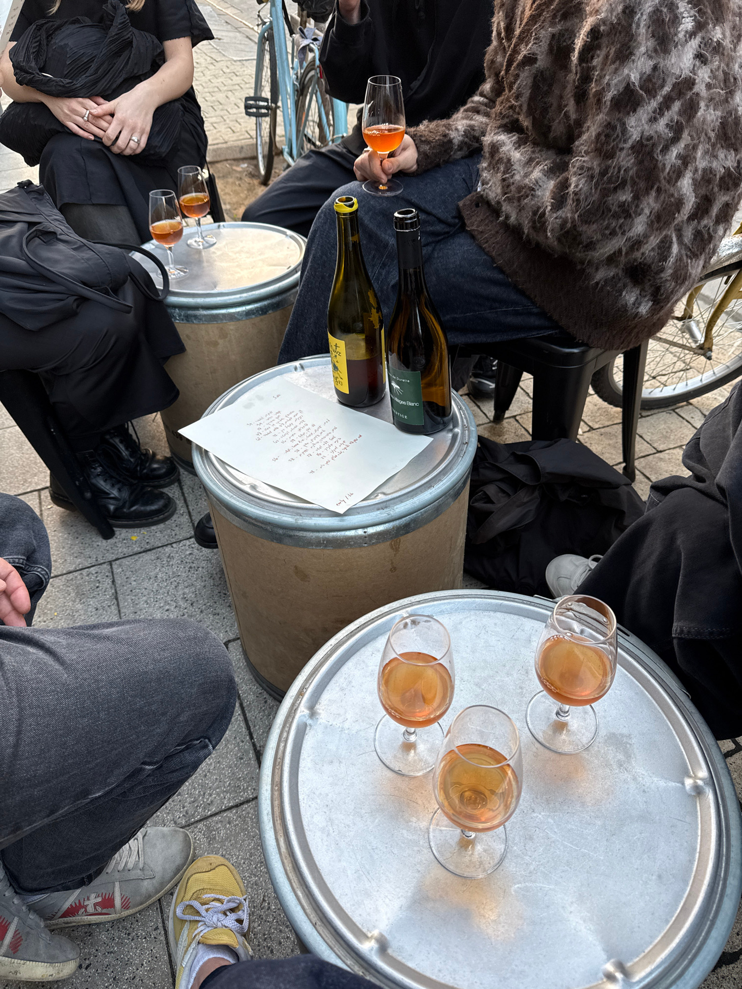 The image depicts a group of people gathered outdoors, likely in a casual urban setting, possibly Tel-Aviv, Israel. They are sitting around improvised tables constructed from what appear to be metal d…read more