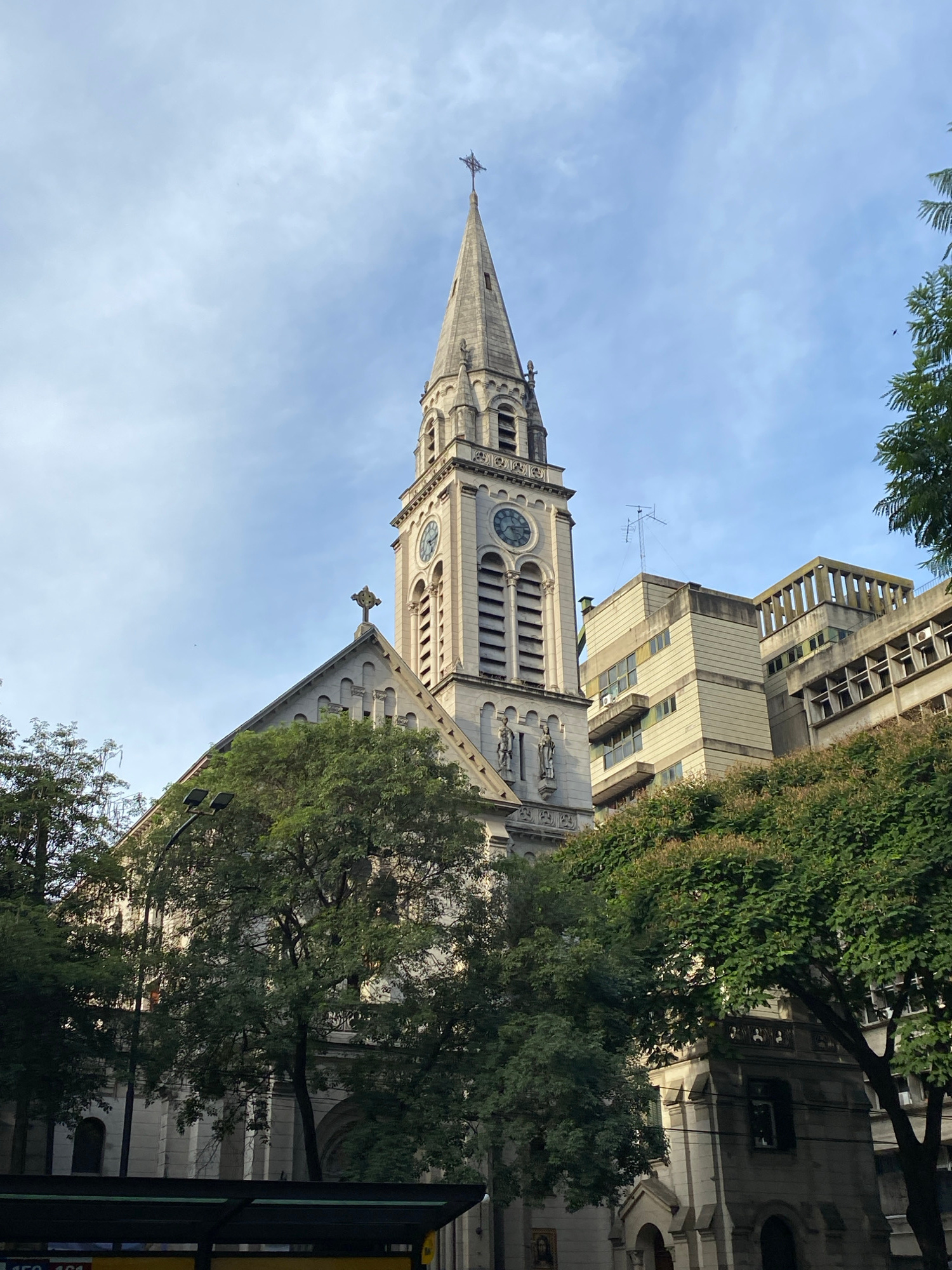 The image depicts a view of the steeple and clock tower of the Basilica del Santísimo Sacramento in Buenos Aires, Argentina, from a low angle. The architecture of the church is visible with its pointe…read more