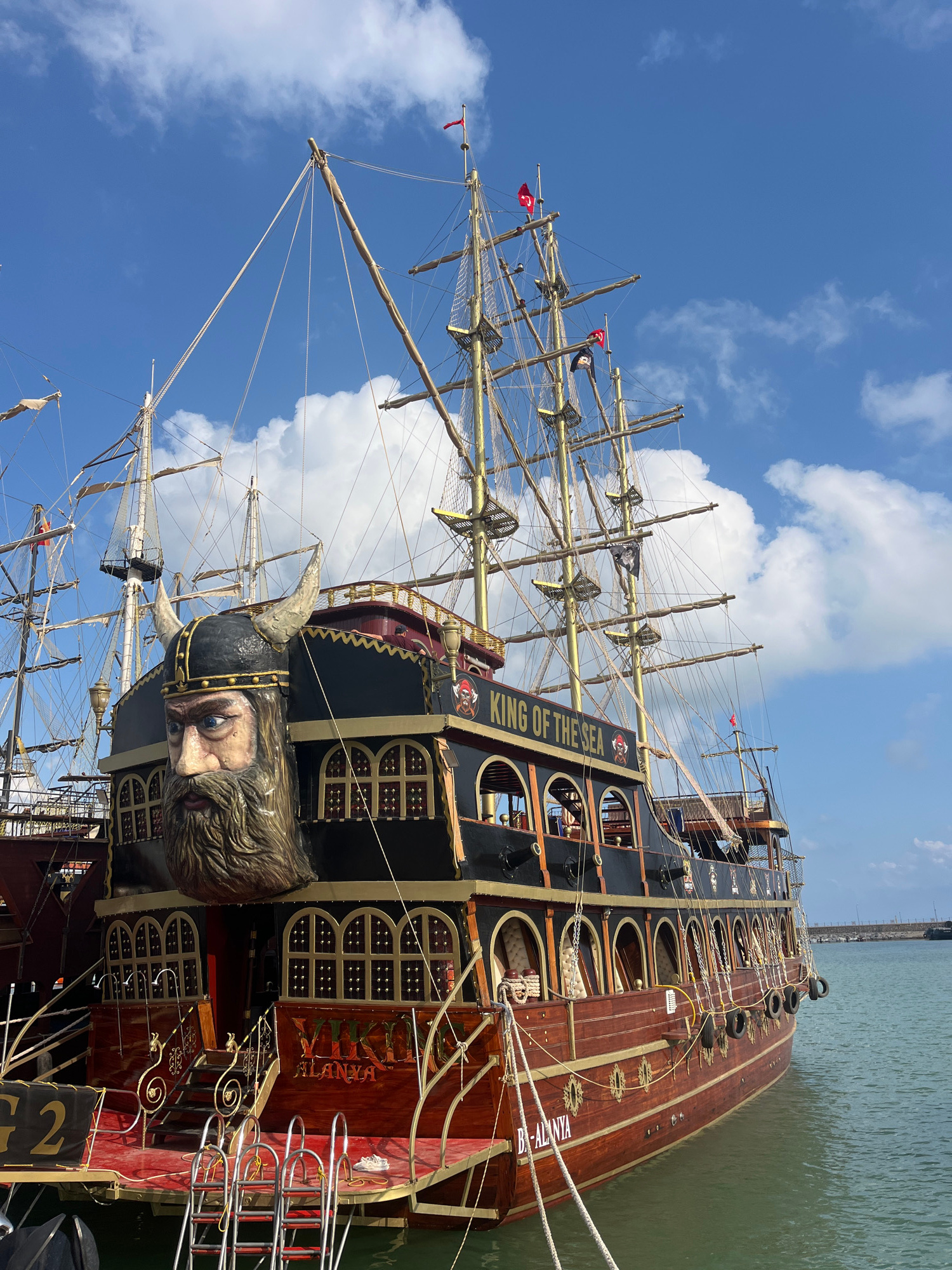 The image shows a large, ornate ship docked in what appears to be the city of Alanya, Turkey, based on the writing "B-Alanya" on the ship's stern. The ship is elaborately decorated, with a figurehead…read more