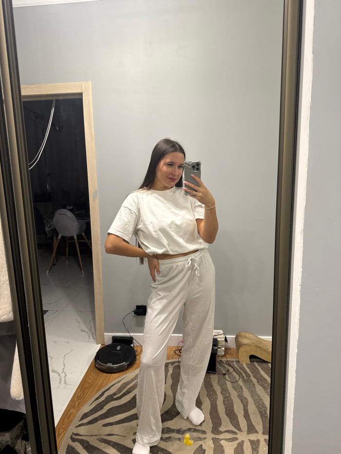 A woman in a mirror selfie wears a white t-shirt and striped lounge pants. She stands in front of a closet with a mirror. A doorway leading to a room with a chair is visible. The floor is part marble…read more