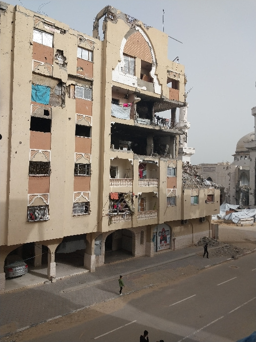 The image captures a severely damaged multi-story building in Khan Yunis, Palestinian Territory, under an overcast sky. The building, primarily tan with brown accents, exhibits extensive structural da…read more
