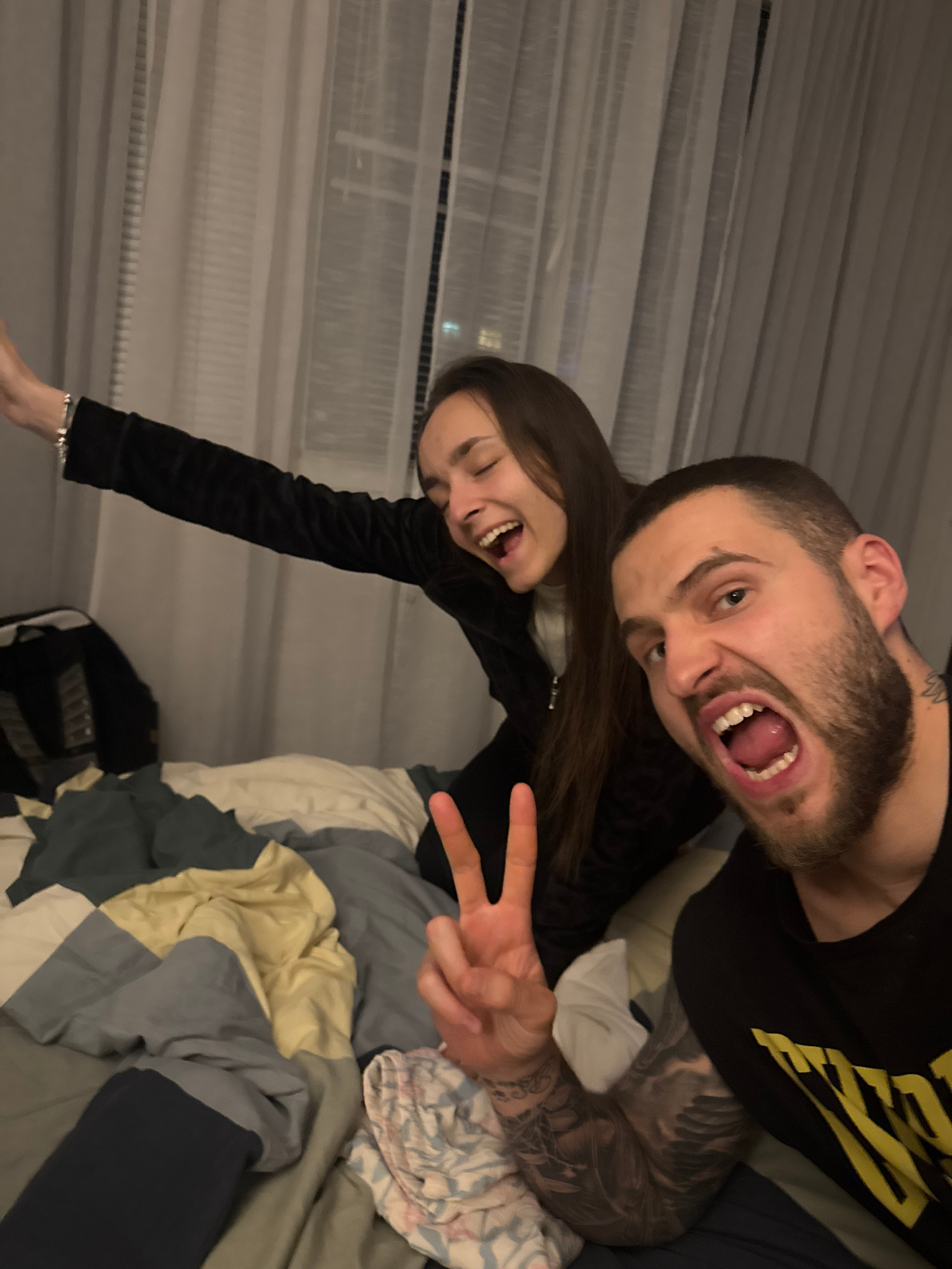 Two individuals are posing for a photograph indoors. A man with a beard, tattoos on his arm, and a black t-shirt is positioned above a woman with long brown hair wearing a long-sleeved black top. Both…read more