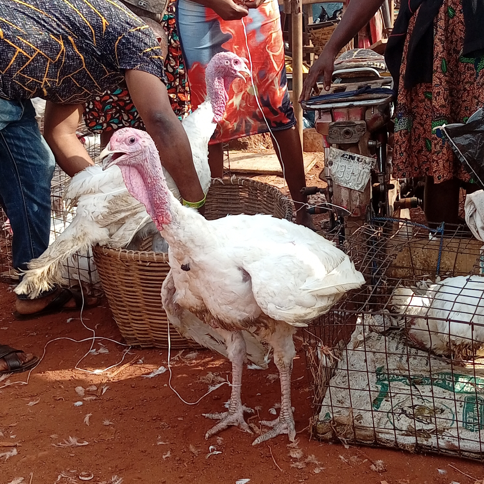 The image captures a bustling scene at a market in Nsukka, Nigeria. A white turkey stands prominently in the foreground, its head raised. Other turkeys are in baskets and cages surrounding the standin…read more