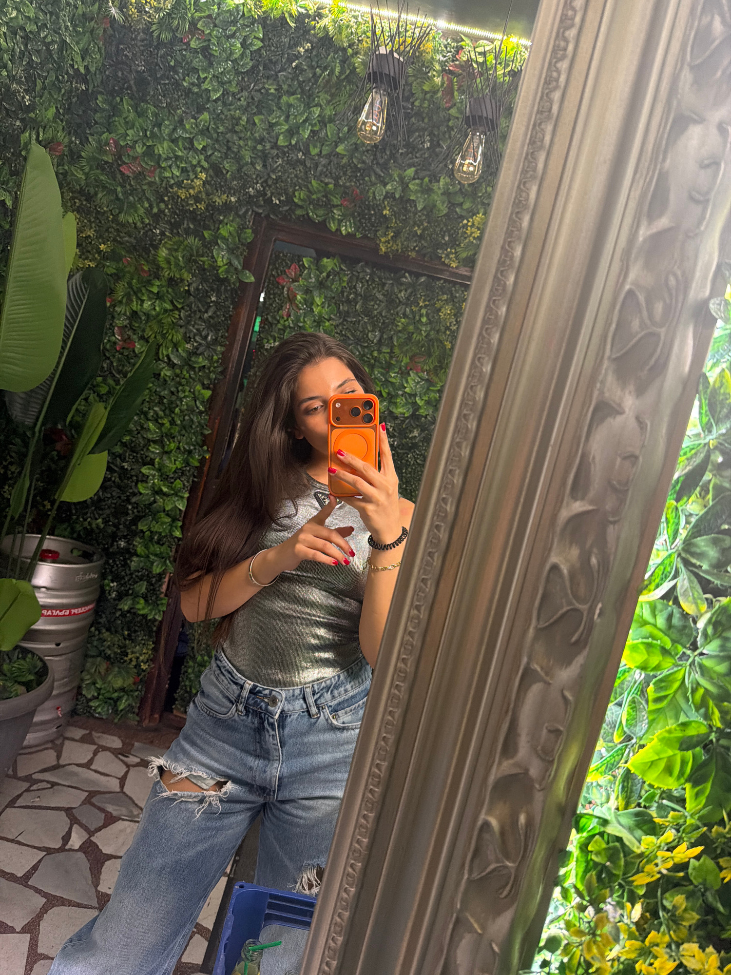 A young woman is taking a mirror selfie in a location that appears to be a bar or restaurant, based on the presence of a beer keg in the lower part of the frame. The interior space is adorned with abu…read more