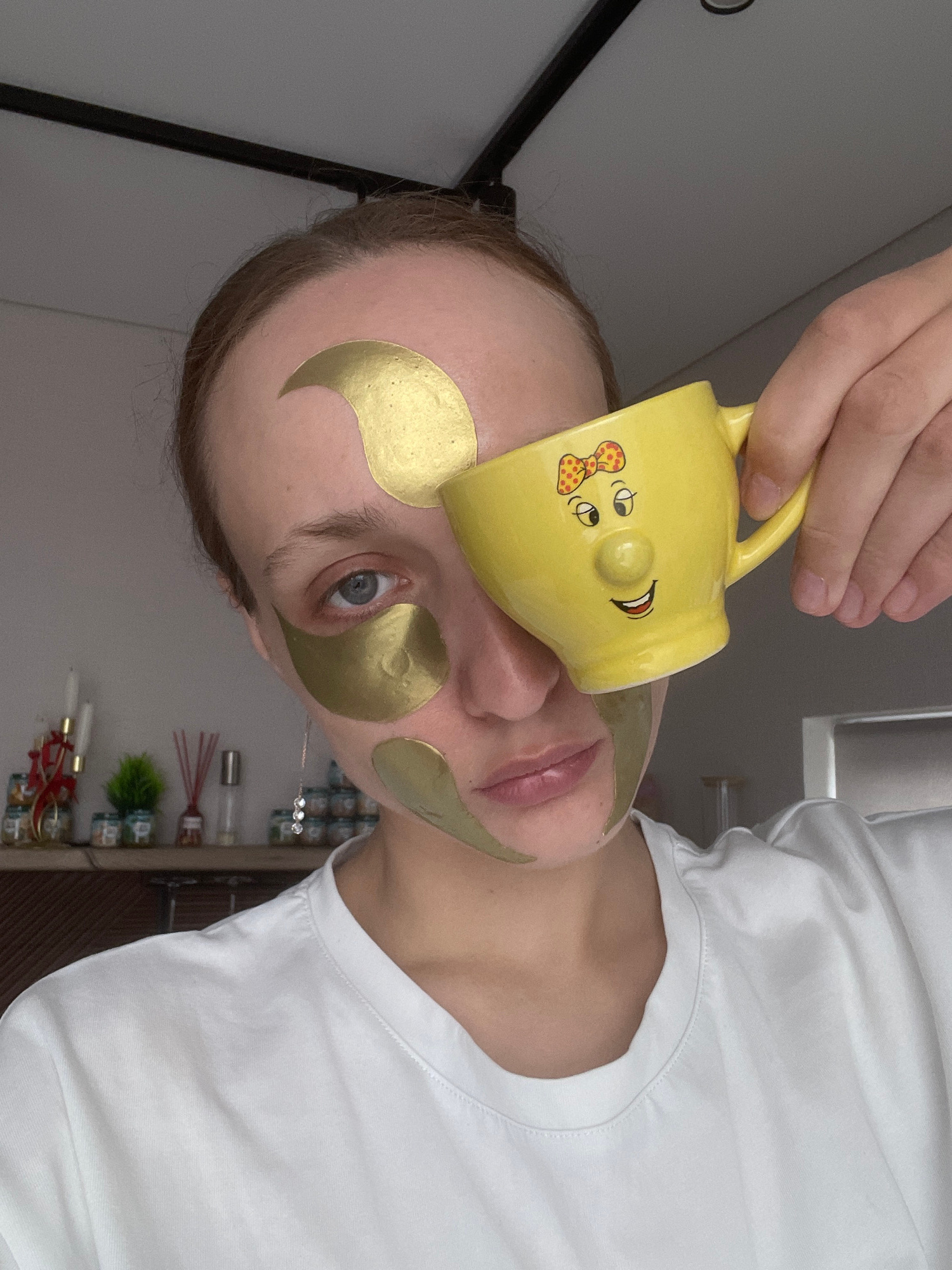 A person with gold eye masks poses indoors while holding a yellow mug. The mug has a cartoon face. The person is wearing a white shirt. A shelf is visible in the background, holding various items. The…read more