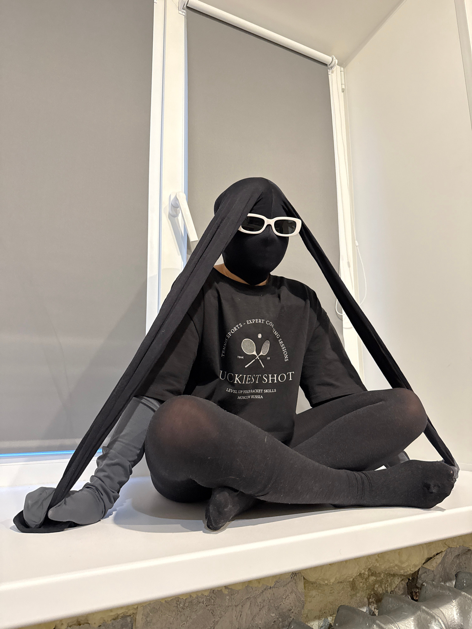A person wearing a black balaclava with white-framed sunglasses, a black sweatshirt with a tennis graphic, black tights, and gray gloves is sitting in a white bathtub. The person's tights are being st…read more