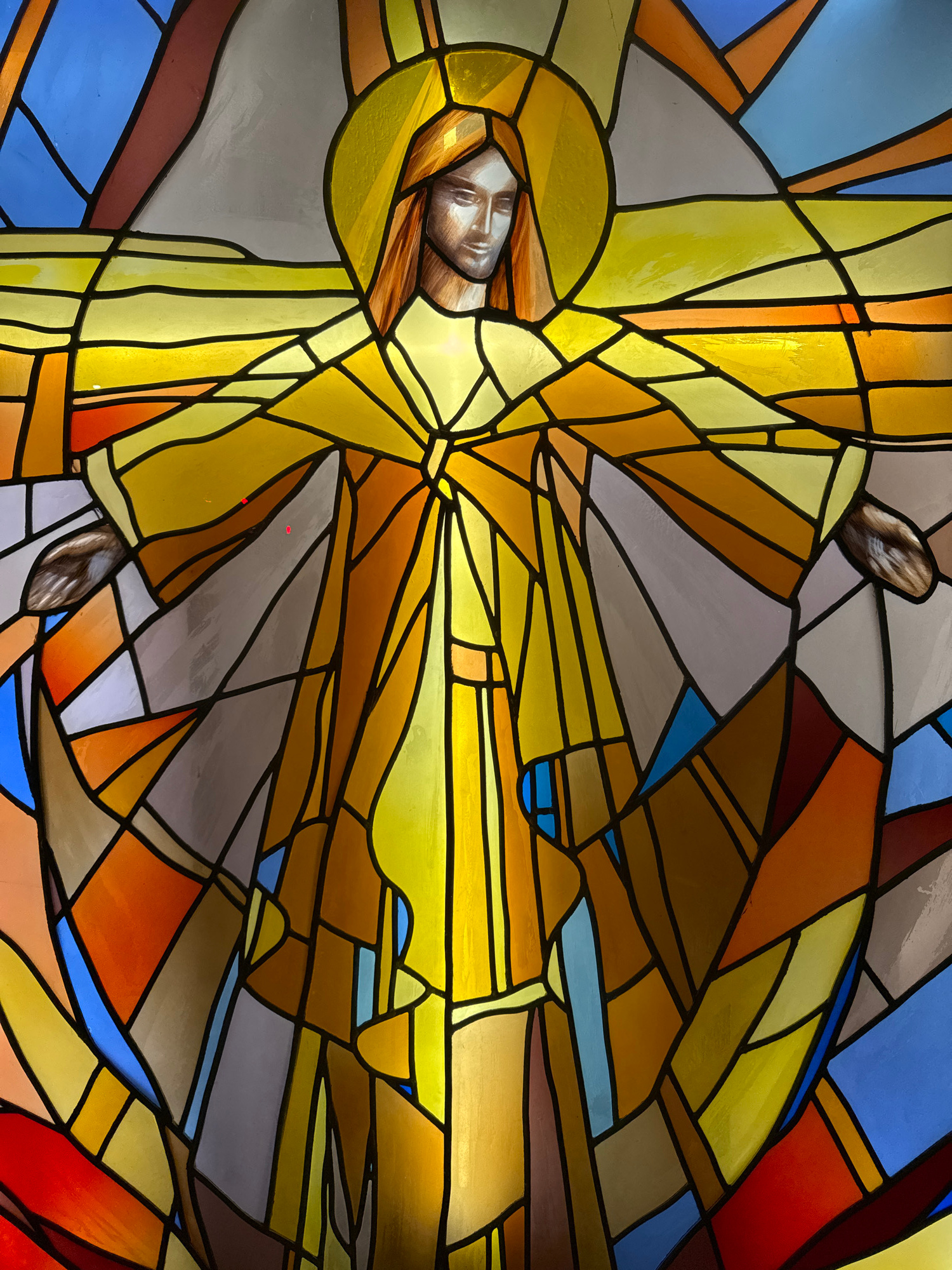 This image is a close-up of a stained-glass window depicting a figure, likely a religious figure, emanating light. The face of the figure is realistically rendered and surrounded by a golden halo. Theβ¦read more