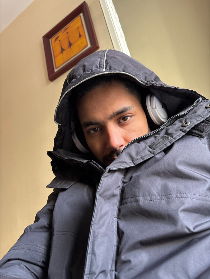 The image depicts a close-up, upward-angled shot of an adult male indoors in Tangier, Morocco. The man, positioned centrally, is looking directly into the camera. He wears a dark grey or black padded…read more