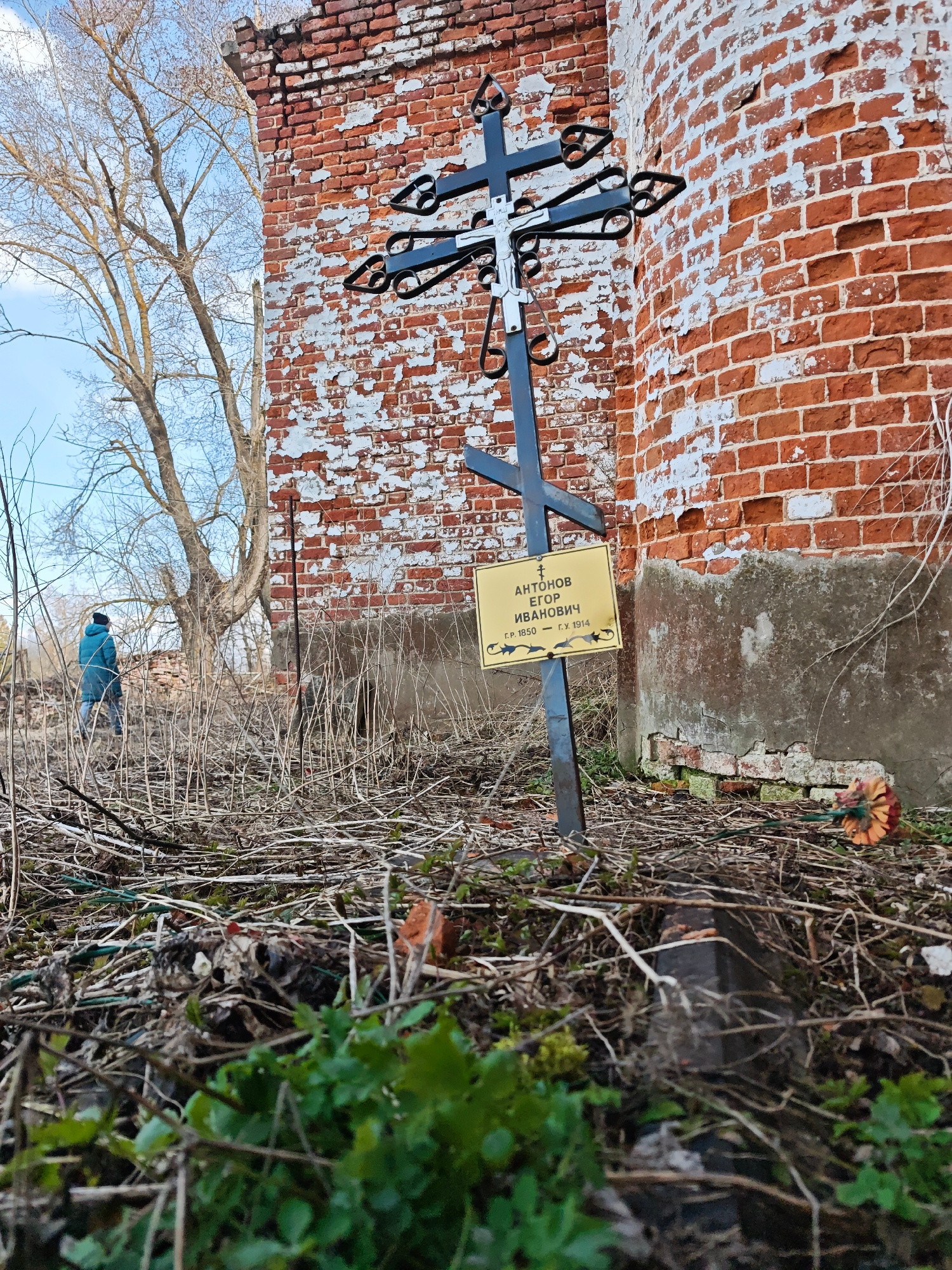 The image shows a black metal Orthodox cross standing in an overgrown area near a weathered brick building in Ивановское, большерогачевский С/о, Russia. The cross has a yellow sign attached, with writ…read more