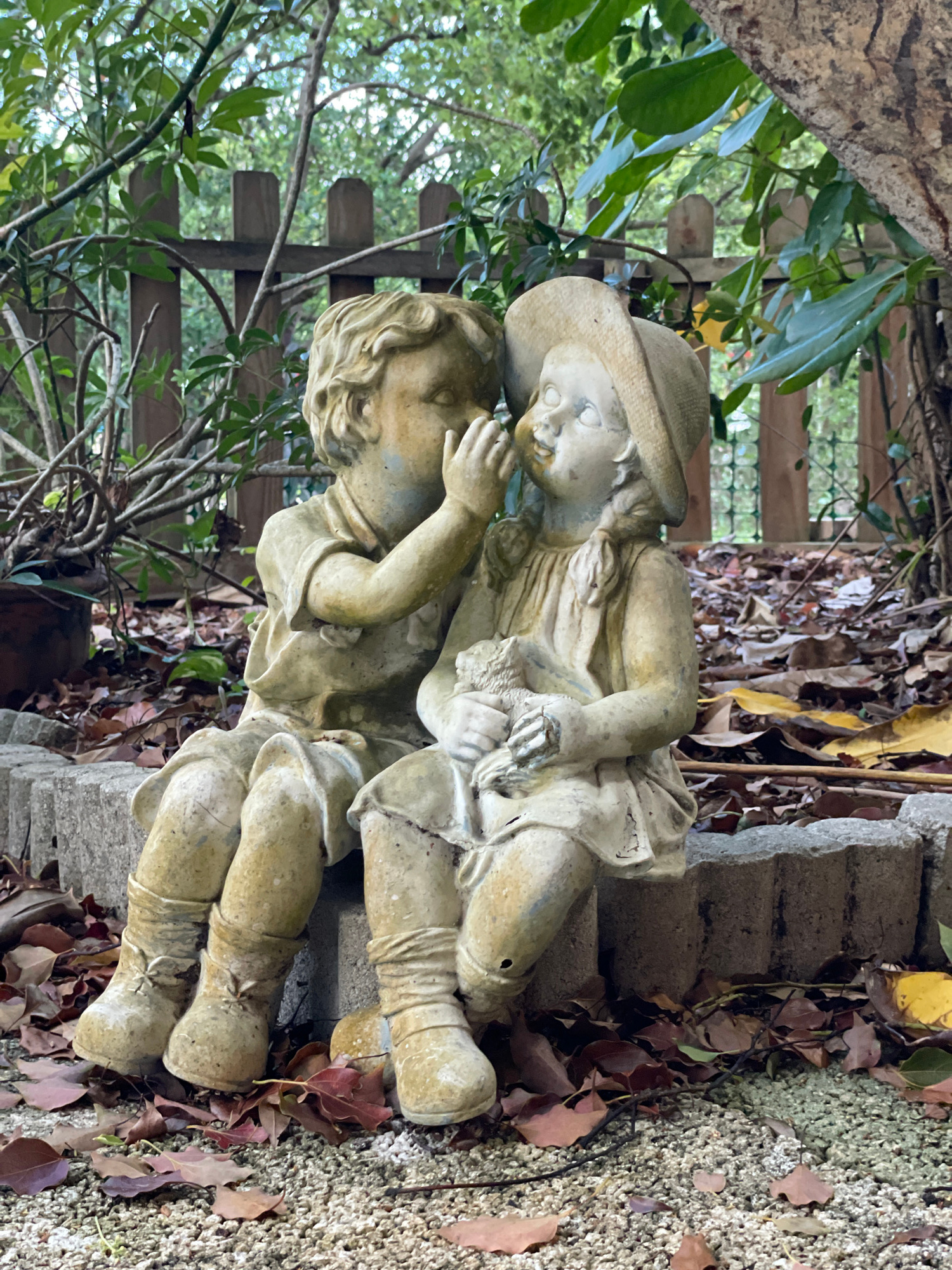 The image shows a garden sculpture of two children. One child wears a hat and appears to be lying on top of the other. The sculpture is located on a low brick structure, possibly steps, surrounded by…read more
