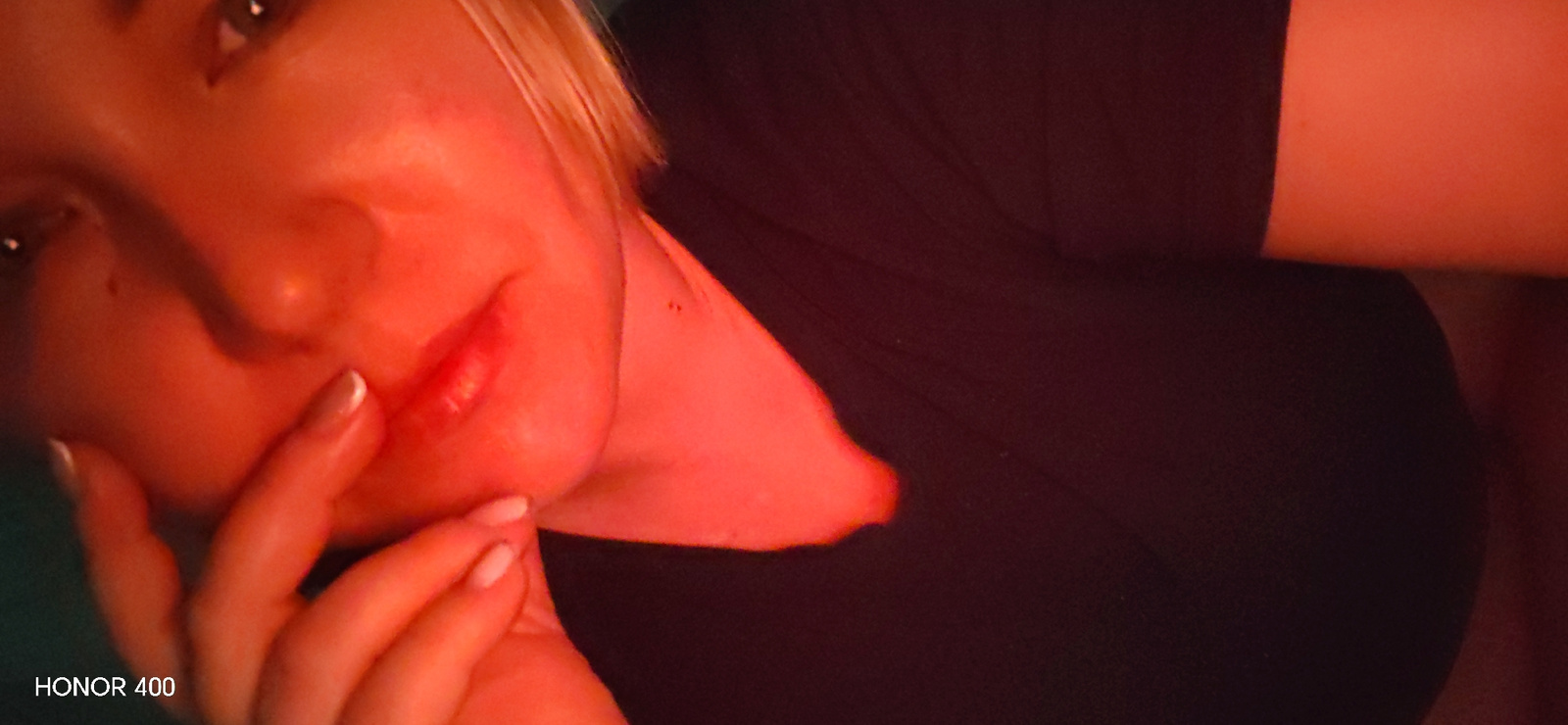 The image presents a close-up, diagonally oriented portrait of a single individual, identified as a female, illuminated predominantly by a red light source. The subject's face occupies the left and ce…read more