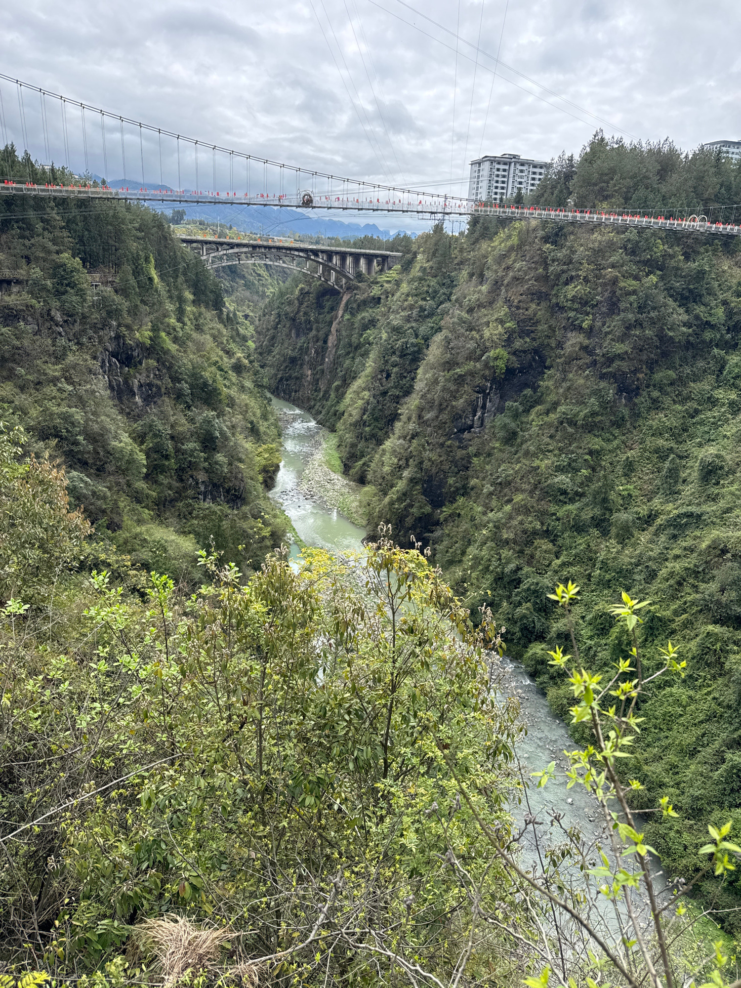 A landscape photograph captures a deep gorge with a river flowing through it, flanked by steep, densely vegetated slopes. On the left, two bridges span the gorge: a suspension bridge with a glass walk…read more