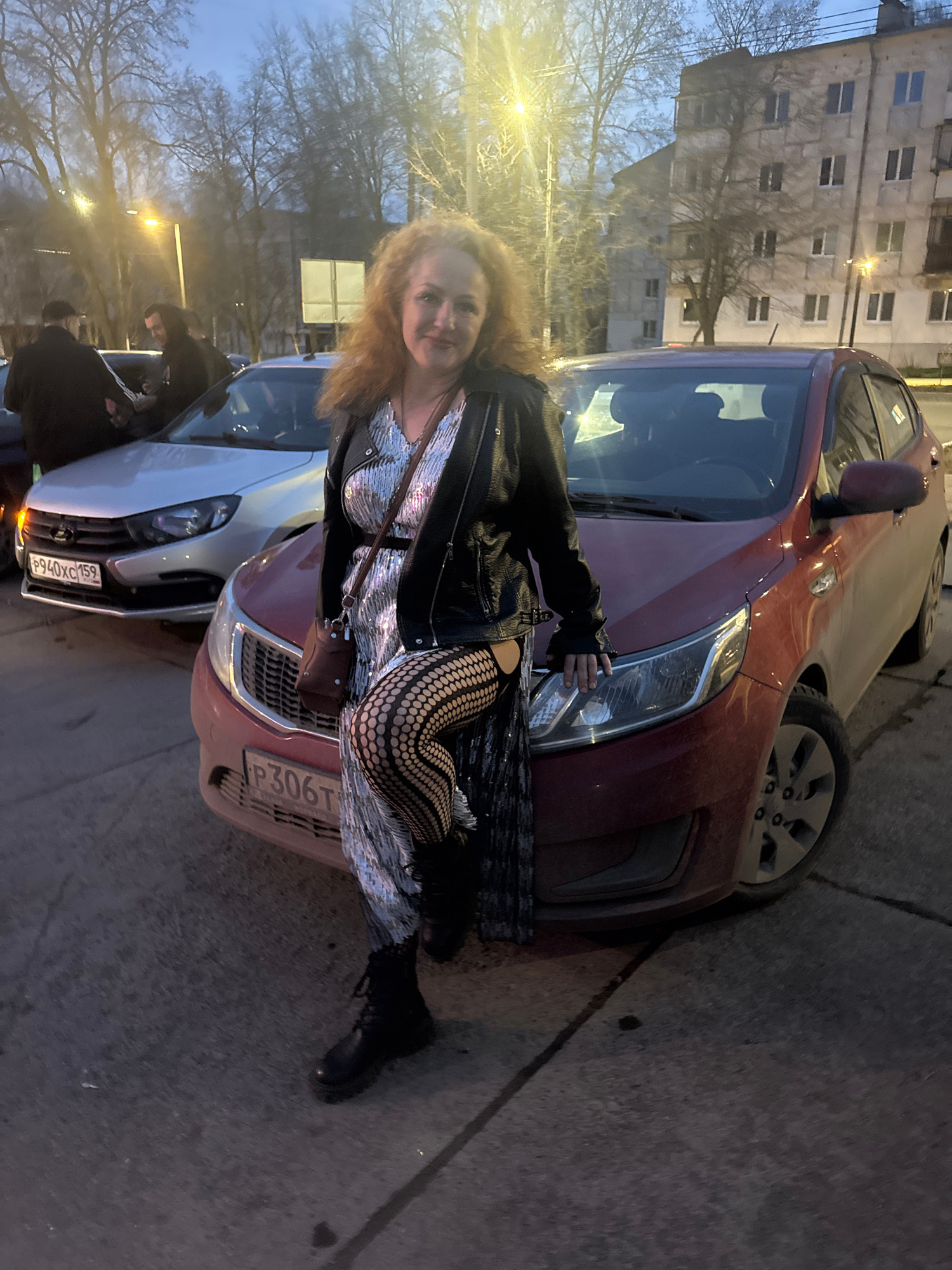 A photograph, oriented vertically, depicts a woman leaning against a maroon car parked on an urban street in Chaikovsky, Russia. The woman has reddish-blonde hair and is wearing a black leather jacket…read more