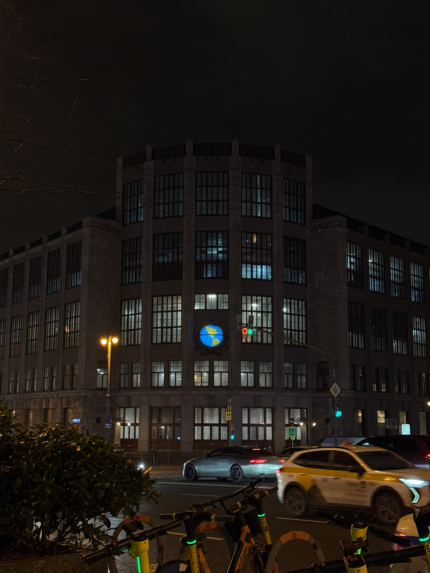 At night, an eye-level, medium shot depicts the Central Telegraph Building in Moscow, Russia. The building is tall and boxy, with rows of windows. A lit globe is visible on one of the floors. Street l…read more