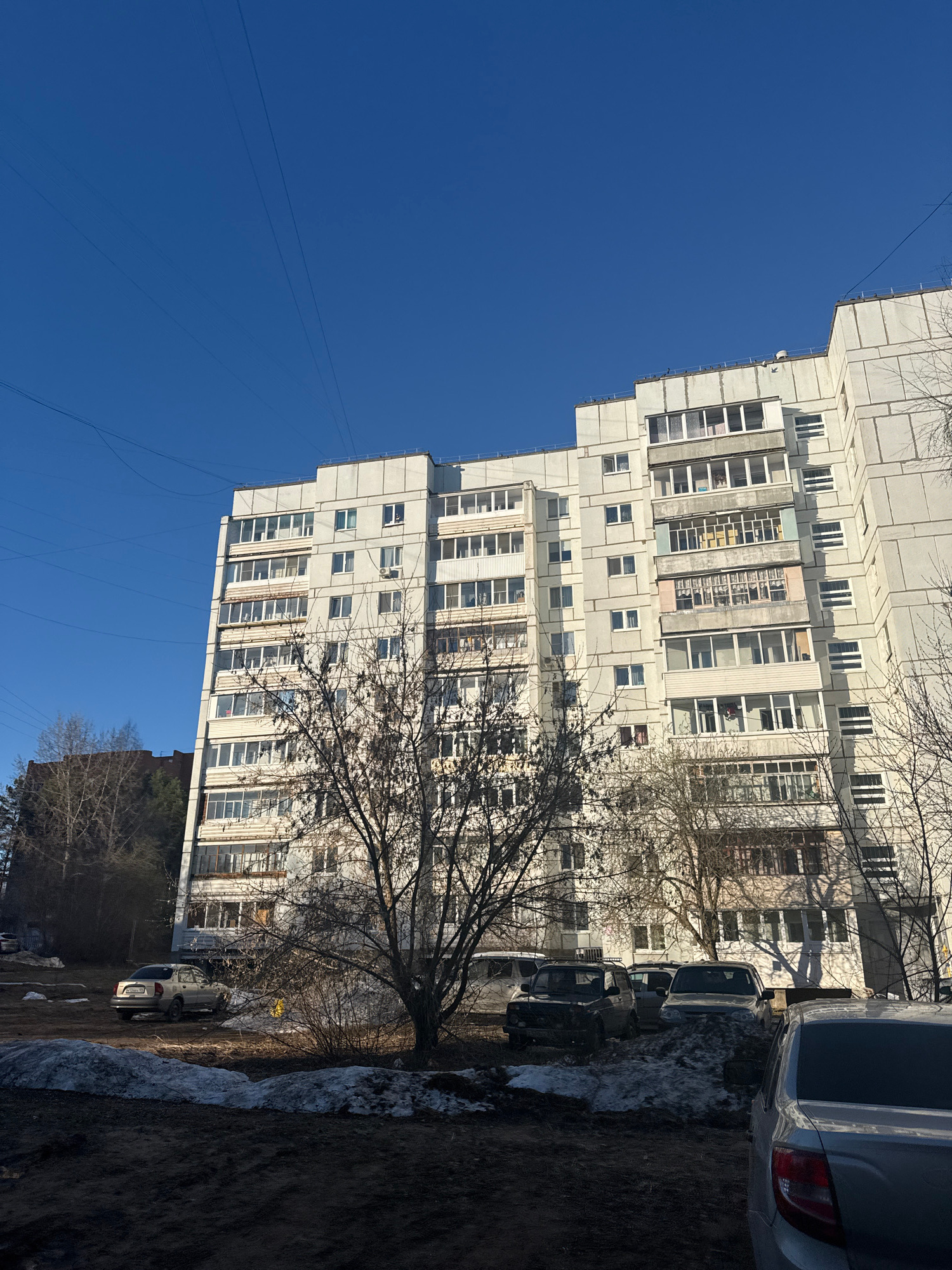 The image depicts a clear blue sky above a Soviet-era apartment building in Chaikovsky, Russia. The building is multi-storied and constructed of concrete panels with rows of rectangular windows. The w…read more