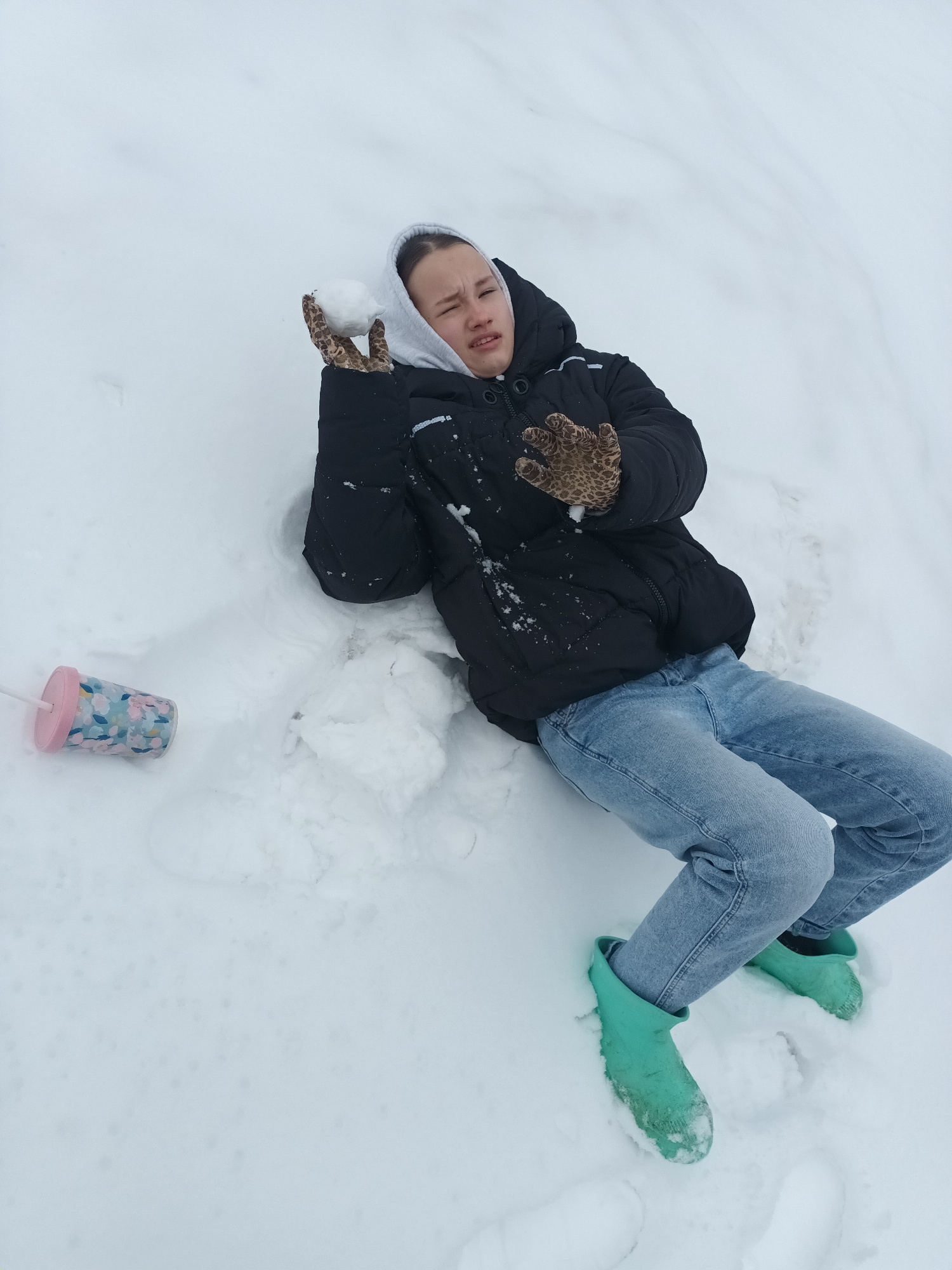 A person is lying in the snow. The person is wearing a black puffy coat, light blue jeans, and bright green boots. The person is also wearing patterned gloves and holding a snowball in one hand. A cup…read more