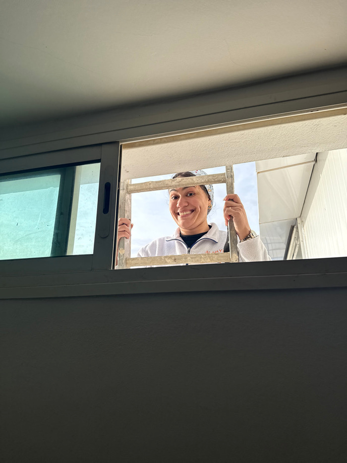 The image presents a low-angle view looking upwards from inside a building towards an exterior opening, likely a window or balcony. A woman is the central subject, seen peering down into the space fro…read more