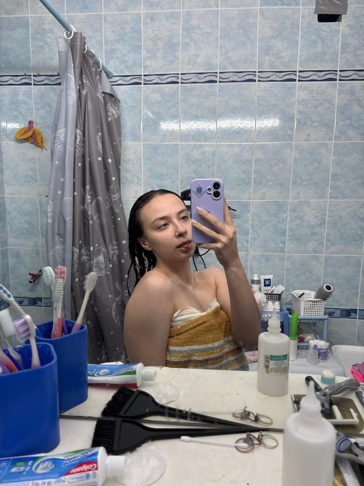 The image shows a young woman taking a selfie in a bathroom. She is holding a purple smartphone with a sticker on its back, and she is wrapped in a striped towel. Her hair appears to be wet. The bath…read more