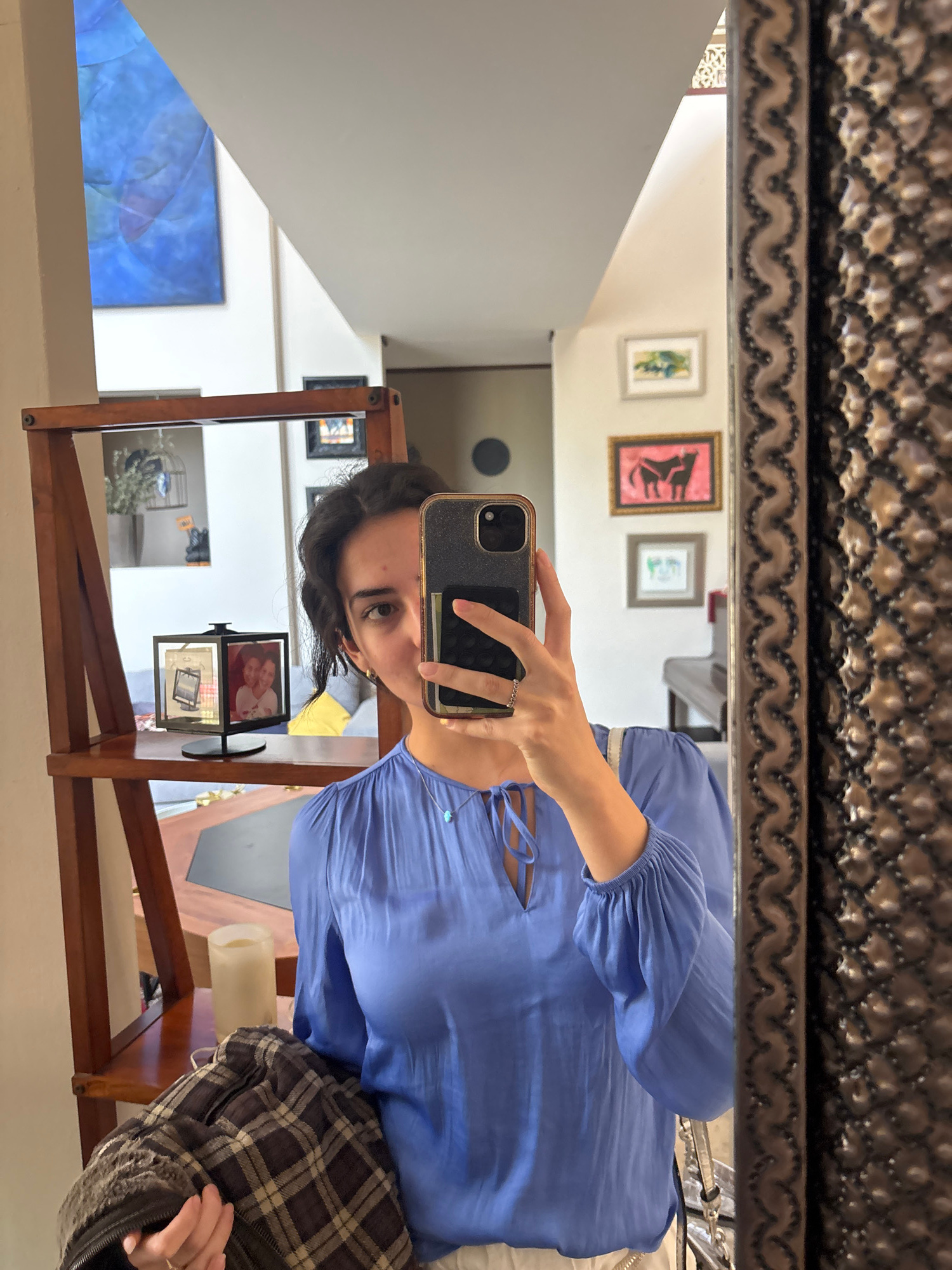 A person is taking a selfie in a mirror. The mirror has an ornate dark frame. The person is wearing a blue top. Reflected in the mirror are various framed artworks on the wall. A wooden stand with rot…read more